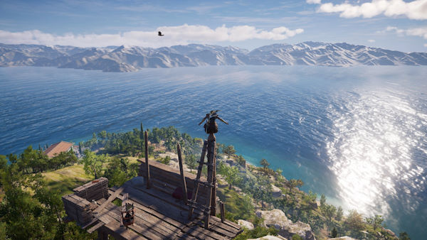 Techniquement, c'est magnifique ! Par contre je regrette que les artéfacts visuels (qui ne peuvent pas se voir sur la photo) ne puissent pas être désactivés... de vision est immense, la région est d'ailleurs assez cossue, ce qui rend cette propension à la verticalité naturellement fascinante, puisqu'on prendra souvent plaisir à faire tourner la caméra, en voulant voir cette beauté architecturale qui nous entoure. Oui, tout est encore plus vertical qu'à Elysée, ce qui fait que notre misthios a plutôt intérêt à pouvoir sauter de très haut, sans quoi les déplacements deviennent vite infernaux (bien que je crois qu'à ce stade du jeu, c'est une aptitude forcément acquise).