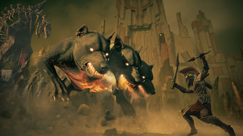 L'arrivée en enfer sonne comme une claque dans la gueule ! Le contraste avec l'Elysée est saisissant ! cette première partie terminée, nous laissant sur un cliffhanger mémorable (qui devait vous "hyper" pour la sortie de la suite), le 2e chapitre s'ouvre sur le combat opposant le misthios à Cerbère, le toutou à 3 têtes d'Hadès, gardien de la porte des enfers. Encore une fois, nous sommes face à un combat déséquilibré face à un boss surpuissant qui vous demandera de bien gérer votre santé et votre adrénaline, et de consommer un nombre impressionnant de flèches tant le combat au corps à corps est presque impossible. Une fois l'animal vaincu, Hadès en personne vient vous réprimander et vous somme alors de lui trouver non pas 1 mais 4 gardiens, pour les 4 portes de son funeste royaume. Un Hadès (aussi connu sous le nom de Pluton dans la mythologie romaine) qui n'est pas bien beau, et encore moins impressionnant, avec sa peau verdâtre et un look finalement assez éloigné de l'idée qu'on peut avoir de ce Dieu.