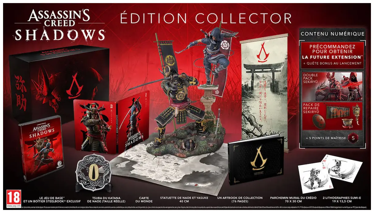 Il existe également une édition Collector du jeu. Au niveau de la teneur "in game" on retrouve le contenu de l'édition Deluxe (le matos Sekiryu et les 5 points de maîtrise donc). Après la grosse boite contient un artbook de 76 pages, le tsuba (le garde-main) du katana de Naoe grandeur nature, une carte du monde, le parchemin mural du Crédo, 2 lithographies, un boîtier "steelbook" exclusif avec le jeu physique dedans (je préfère préciser car de nos jours, ce n'est plus systématique) mais aussi et surtout une superbe figurine de 40 cms. Une bien belle pièce, au sein d'un somptueux collector (j'aurai pas craché sur l'OST ceci dit), disponible sur Xbox Series X et PS5 au prix (aïe) de 240€. Et oui, ça pique un peu. On notera que cette édition Collector existe aussi sur PC, mais ne contient aucun disque, juste un code de téléchargement, je suppose en plus pour le UbiStore. Franchement, ils auraient pu faire un effort sur le prix du coup...