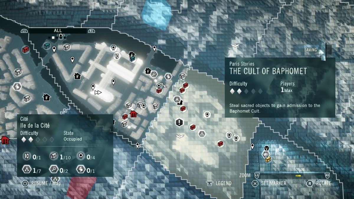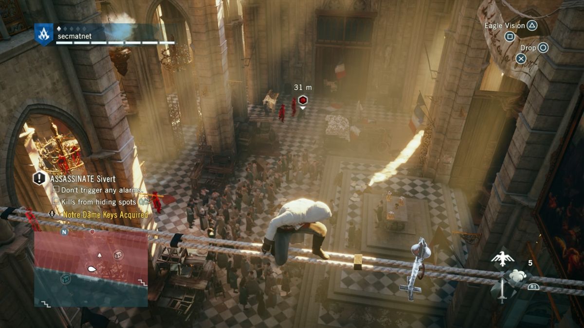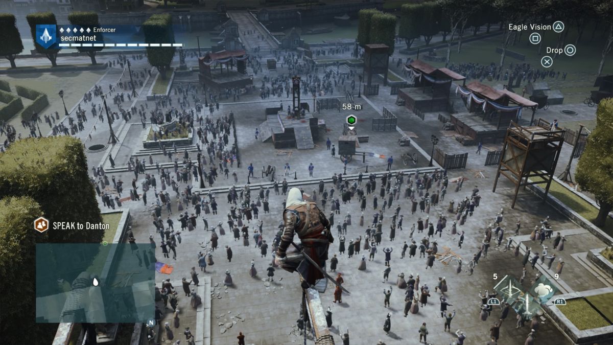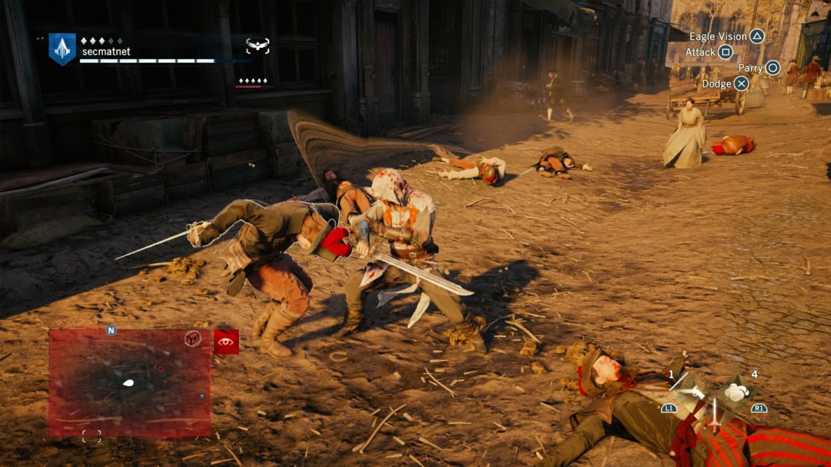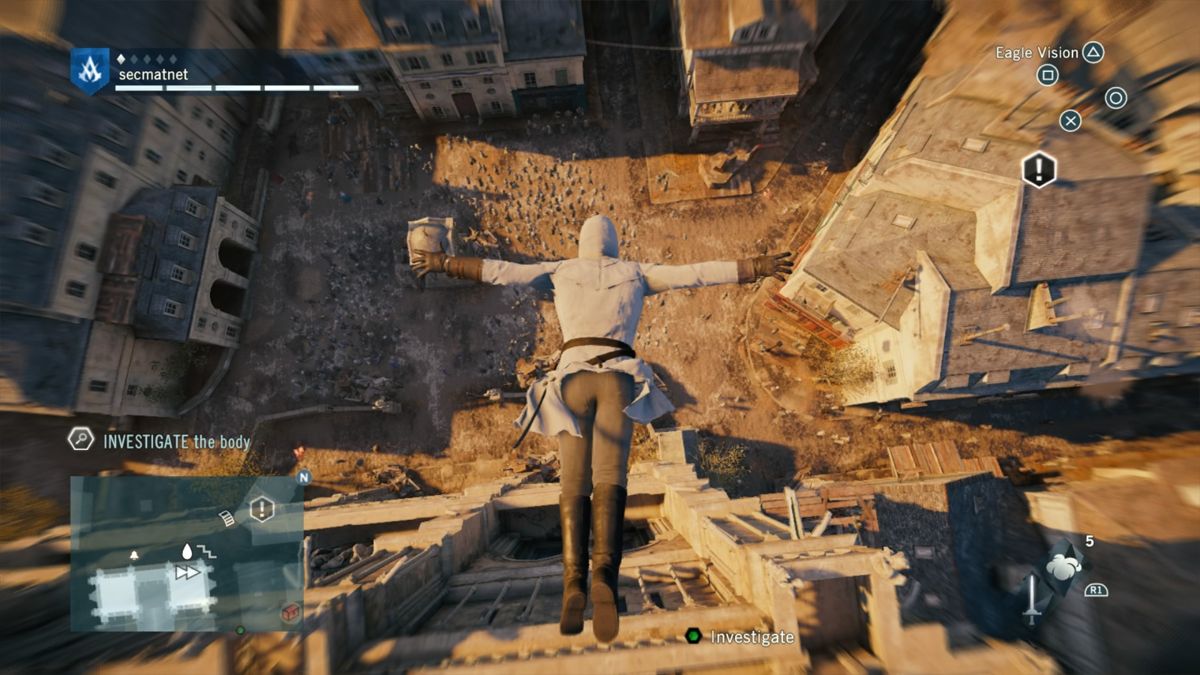 Niveau gameplay, Assassin's Creed Unity est assez classique et ce malgré la refonte du système de "free run" : tout a été revu afin d'offrir une fluidité et une aisance que les anciens épisodes avaient perdus. Alors bien sûr, il existe toujours des bugs déjà vus et revus, et certaines actions ont toujours "du mal à sortir". Par moment l'ergonomie des touches ne rend pas optimales chaque action. Après le jeu offre du crochetage, des combats, de la gestion et de la création d'équipements. Il y a les missions principales et les missions annexes où (pour une fois) il y a du choix : des énigmes, des mini-missions scénarisées (type enquête, recherche...), et il y a bien sûr les sempiternels objets à trouver (arrêter messieurs les développeurs de croire que trouver des centaines d'objets soit fun, c'est faux ! -_- ).