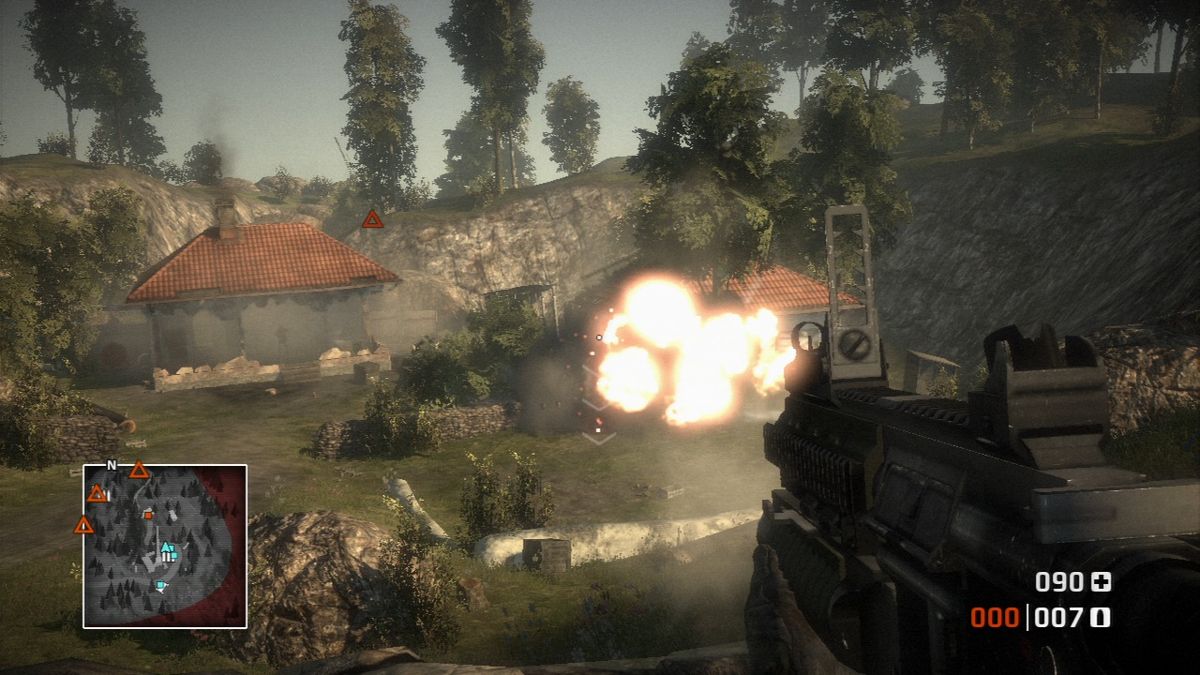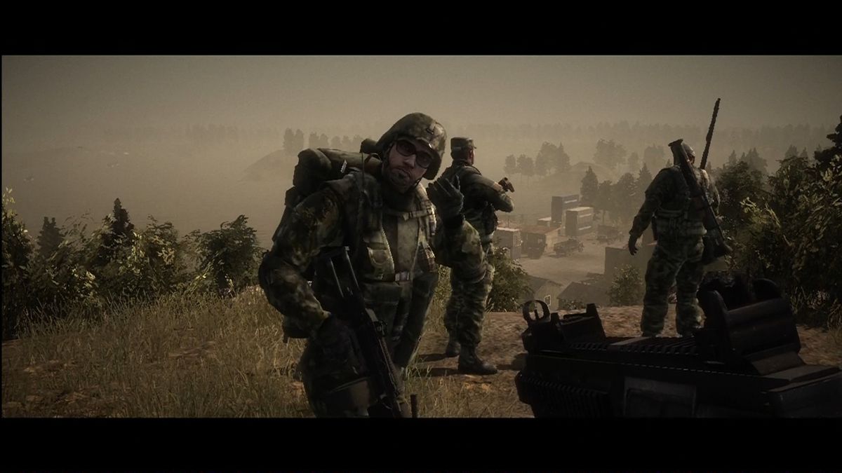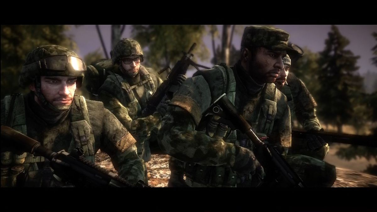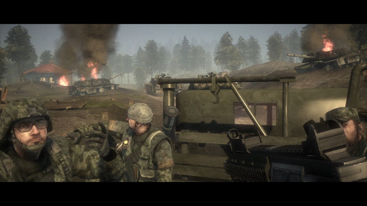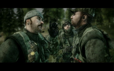 Bad Company est vraiment un beau jeu qui exploite parfaitement nos consoles jeu nous assène un gros loading à chaque niveau, puis le streaming fait ensuite son boulot, nous évitant de longs chargements toutes les 5 minutes. Et on peut le dire, Battlefield : Bad Company est super beau ! Le moteur développé par DICE, le Frostbite Engine, tourne à plein régime sur nos consoles. En premier lieu on appréciera la qualité des modélisations, qui rendent les cut-scenes extrêmement détaillées. Certes les protagonistes ont encore quelques mouvements erratiques, comme s'ils avaient des spasmes musculaires, mais globalement ça reste rare, le travail sur l'animation étant admirable. J'en remets une couche sur des briefings omniprésents en lieu et place des cinématiques (qui elles, restent rares), mais où on pourra ainsi apprécier le travail des graphistes. Question décors, Bad Company se renouvelle peu. C'est presque toujours des espaces ouverts et de jour, des étendues verdoyantes où sont parsemées routes, arbres et bâtiments.