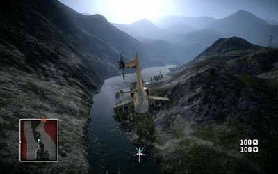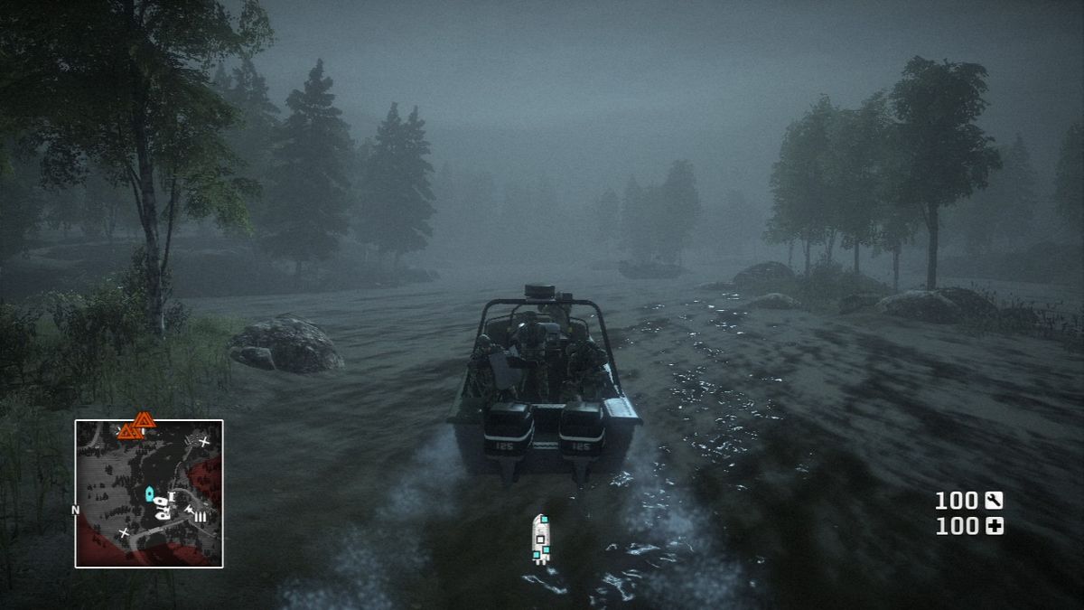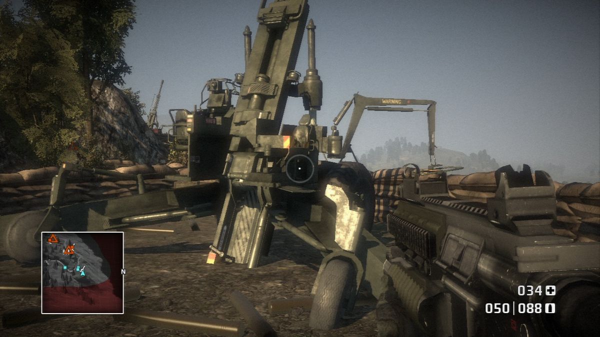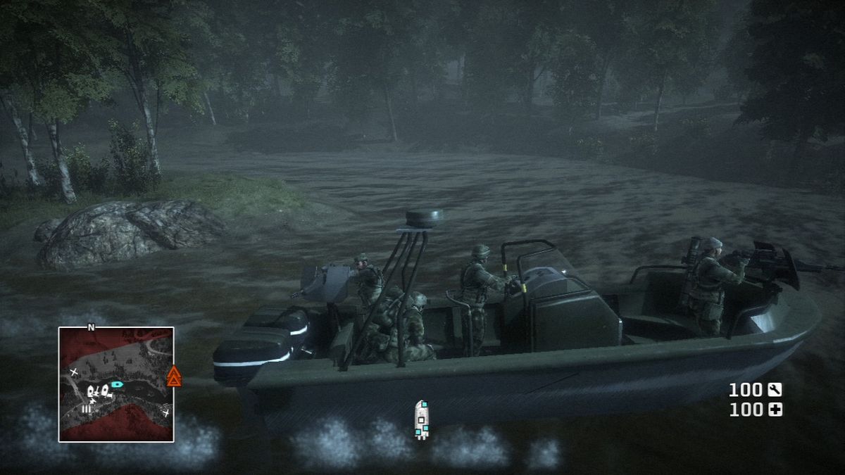 L'humour apporte un gros plus à l'ambiance :) là qu'intervient l'outil de réparation, dans une manipulation simplement idiote. Imaginez qu'on a entre les doigts une sorte de visseuse sans fil et qu'en touchant le véhicule on le répare presque instantanément. Le résultat est débile et comme dit Cacilie, vouloir réparer son véhicule c'était l'occasion de faire une scénette avec un personnage s'affairant plutôt que de voir ce spectacle affligeant. Malgré cet aspect sommaire (qui sera repris dans bien des titres tels que Far Cry 3), force est de reconnaitre que ça rend bien service et que ça ajoute un petit plus au gameplay. Pour en finir avec les moyens de transport, il faut savoir qu'avec Bad Company on est loin d'avoir un bête FPS cloisonné par des murs invisibles.