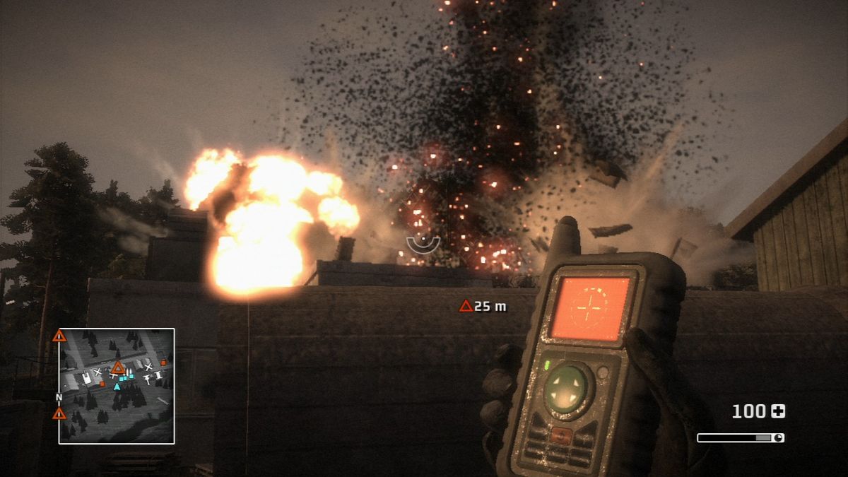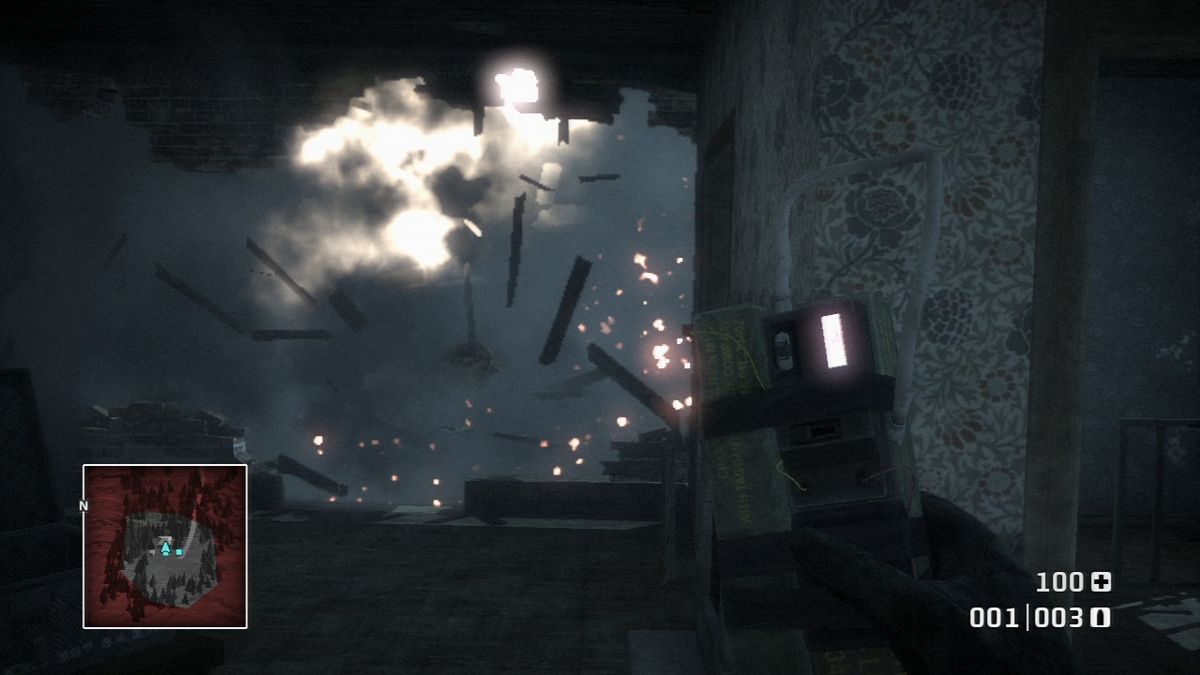 La destruction massive est particulièrement réaliste... et jouissive ! ^.^ il est impossible de réduire une maison en gravillons, il restera toujours des pans des murs "invincibles" aux tirs, ou au pire une ossature, une charpente. Si on met de côté cette volonté de ne pas aller jusqu'au bout des choses (contrairement à un Red Faction : Guerrilla qui nous impressionné de ce côté-là), pour le reste c'est l'éclate totale ! Si Preston n'est pas foutu d'ouvrir une simple porte, on peut par contre faire un énorme trou dans le mur pour passer. Tous les bâtiments peuvent ainsi être disloqués, quasiment pulvérisés à coup de grenades, de roquettes ou même avec la commande de tir aérien. Cette dernière occasionne un largage de bombes sur la zone désignée et en général il n'en reste pas grand chose après (c'est pratique contre un sniper isolé qu'on n'arrive pas à atteindre ou contre les tanks).