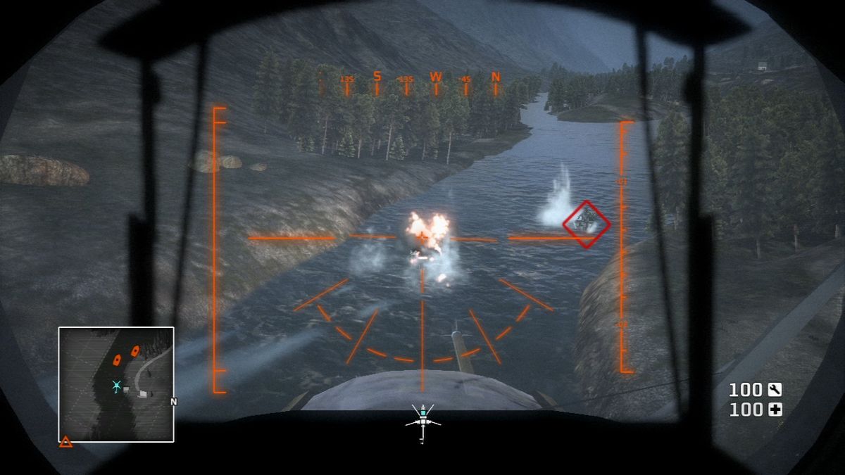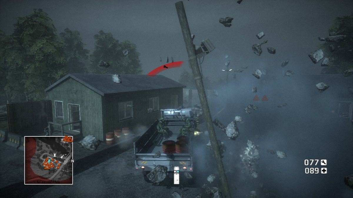 Les véhicules ont 2 vues possibles (externe et interne, on peut d'ailleurs changer la station radio comme dans GTA) et on peut switcher d'une place à l'autre. Personne ne conduit à notre place mais si vous estimez que le gars qui sulfate fait mal son boulot (ça arrive), on peut se mettre à la tourelle l'espace d'un instant. Le maniement des véhicules, bien que tentant d'être réaliste en imposant lourdeur et inertie, est très aisé (pour l'hélico, il faudra quand même bidouiller les options car les commandes de bases sont injouables). Et ces mêmes véhicules peuvent être endommagés.