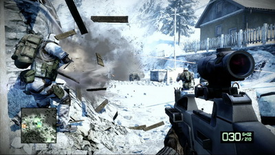 Pareillement, si les maps sont toujours cloisonnées au gré des scripts et semblent plus réduites qu'avant, le jeu permet généralement d'aborder les assauts selon 3 manières différentes : soit on snipe de loin toute éventuelle menace, soit on joue les bourrins et on explose tout, soit on se la joue classique, les couilles dans une main, le fusil dans l'autre, en se mettant à couvert dès que la santé l'exige (et il existe le plus souvent, plusieurs chemins parallèles). Enfin, la destruction massive a été améliorée (dans un sens mais pas dans l'autre, je détaillerai juste après), et c'est sans doute ce qui manque le plus à des titres comme Call of Duty : Modern Warfare.