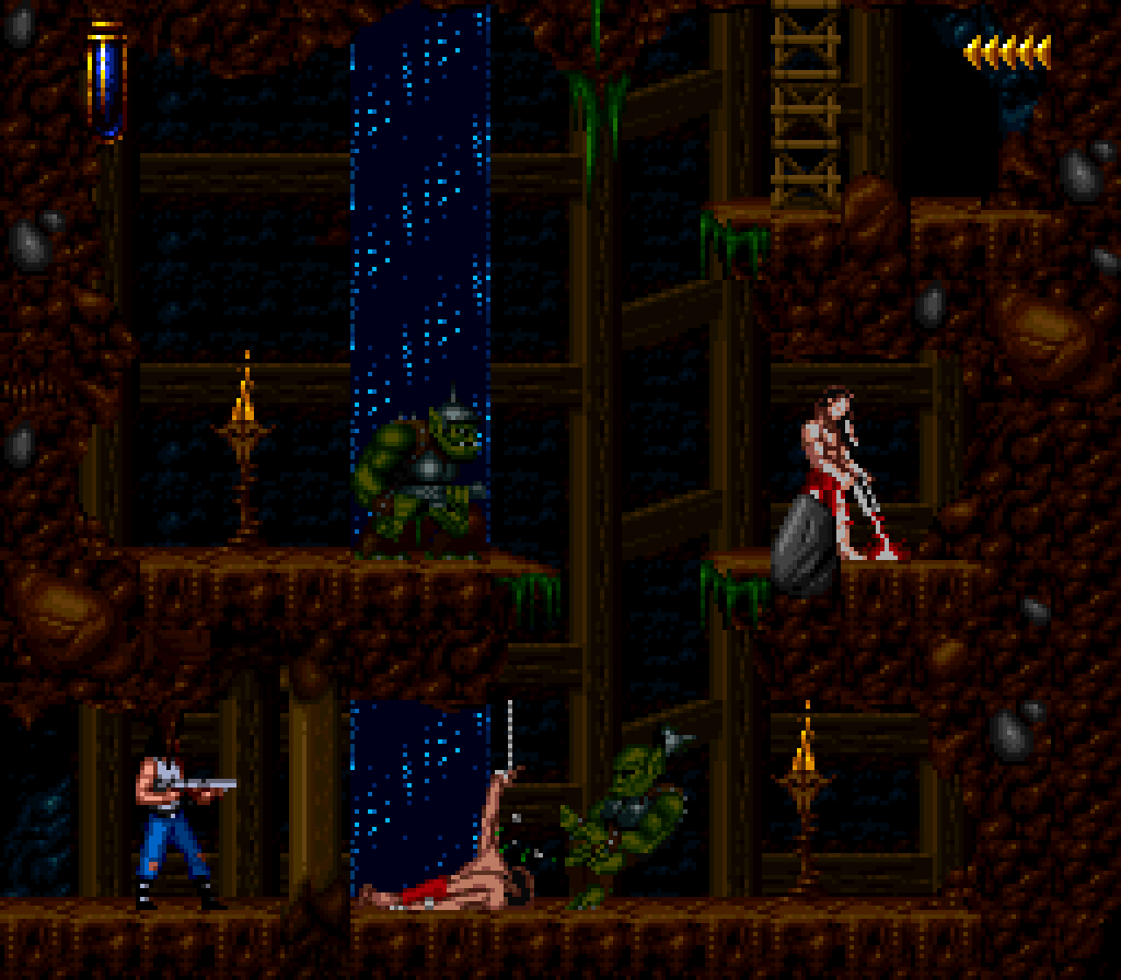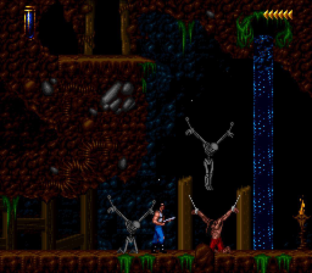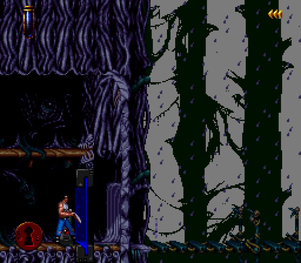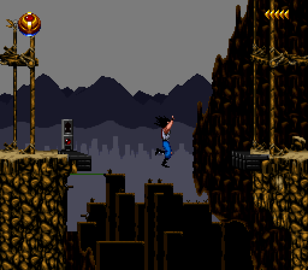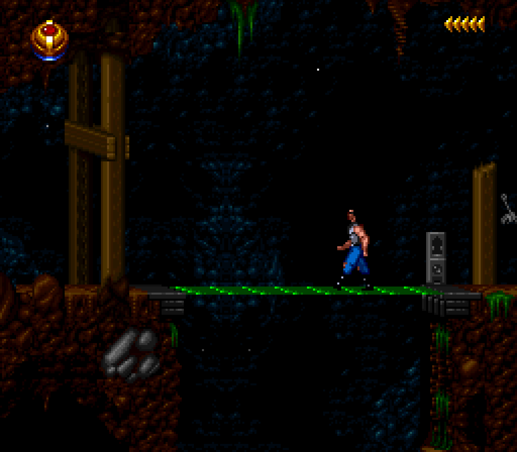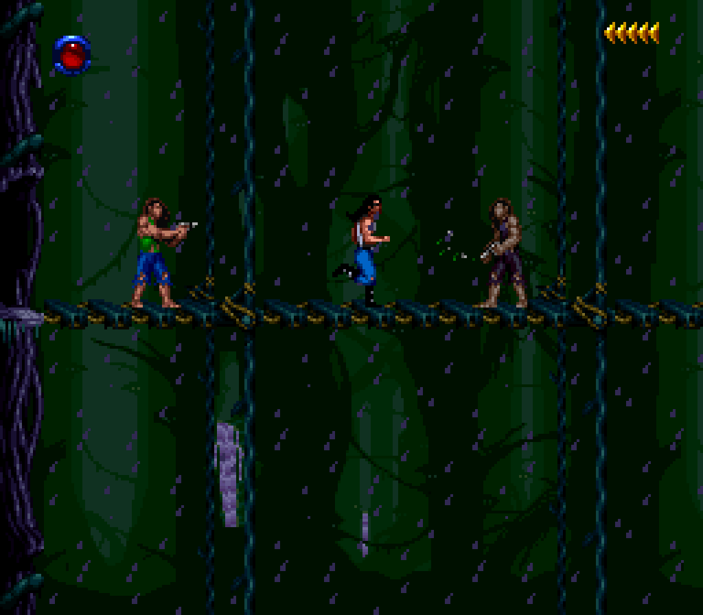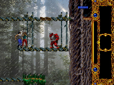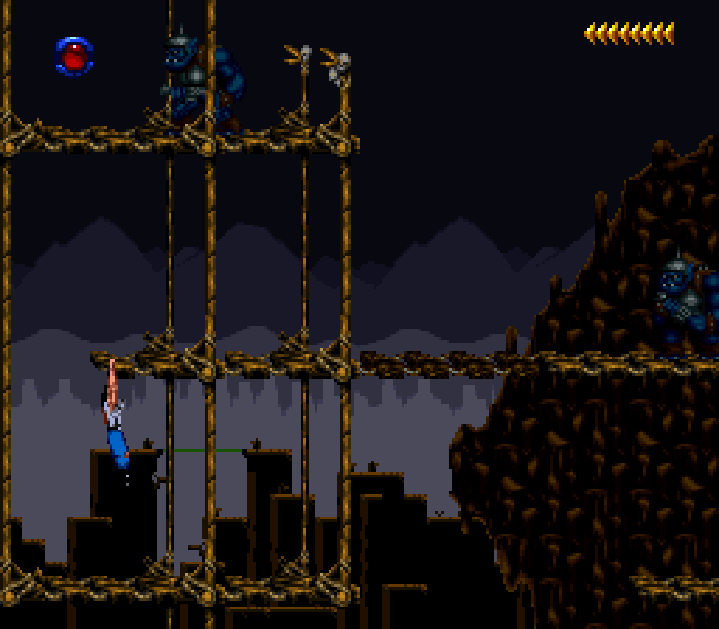 La version Super Nintendo est tout à fait honorable mais... pourquoi est-elle si sombre ?! plusieurs subtilités viennent contrecarrer cette diffamation, à commencer par le système de combats, qui se veut plus tactique encore que dans Flashback et sans bouclier rechargeable (Kyle a pour lui des potions de revitalisation). De plus, se plaquer contre le mur n'empêche pas d'être attaqué au corps à corps, alors que de son côté, notre héros en est incapable (absurde pas vrai ?). Bien sûr, si on meurt, on repart au dernier checkpoint, checkpoint où on nous livre un password. En effet, le jeu étant relativement long (7 à 9 heures tout de même, c'est vraiment pas mal), à chaque niveau (ou sous-chapitre d'un même monde si vous préférez) nous obtenons un code. Etant donné que les objets sont pensés pour être utilisés à bon escient, généralement au passage d'un niveau à l'autre, on n'y perd pas grand-chose. Et si jamais vous vous retrouvez bloqué parce qu'il vous manque un objet (généralement c'est la mort d'un ennemi qui vous les fournit, comme ces bombes qui permettent d'exploser des portes), la solution restante sera de recommencer au dernier checkpoint.