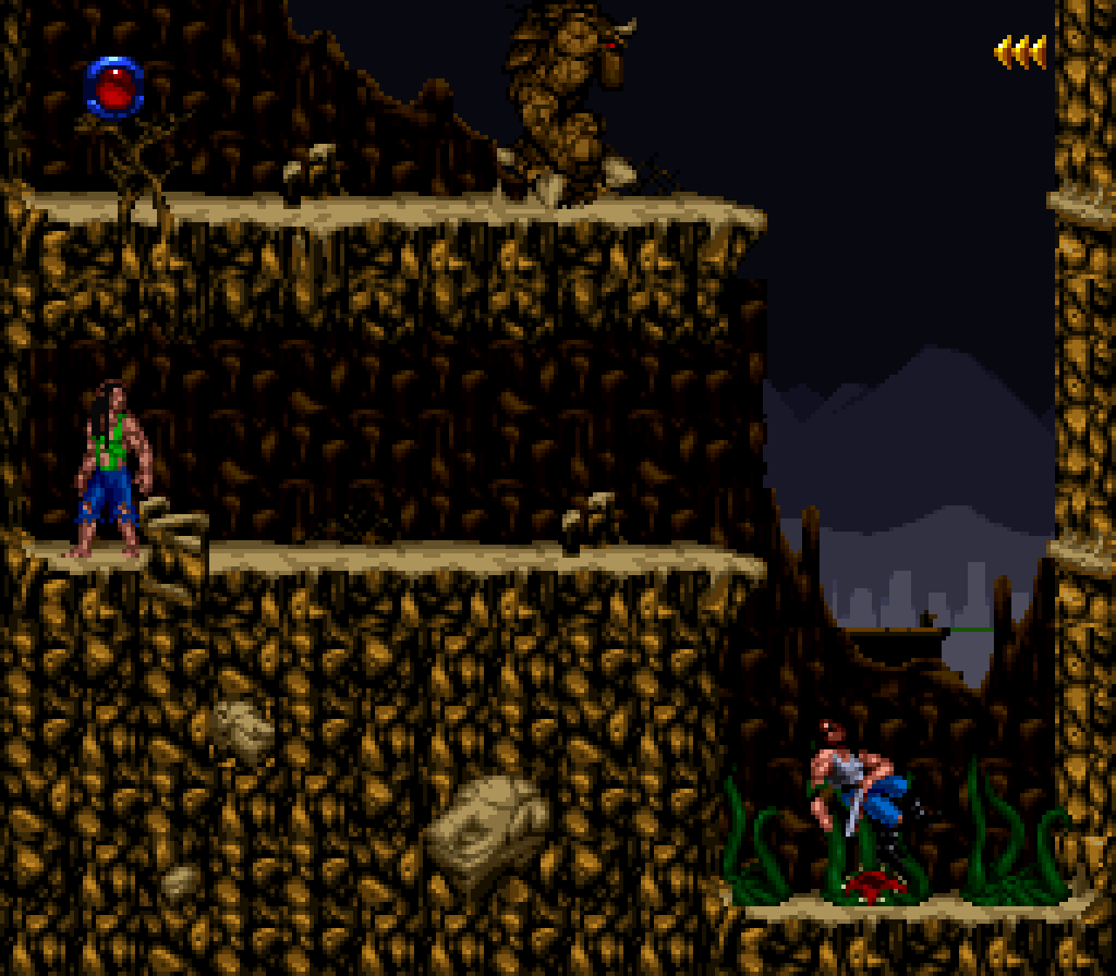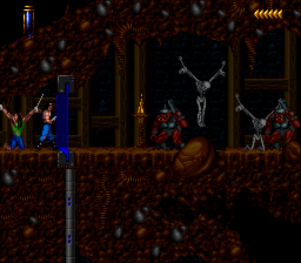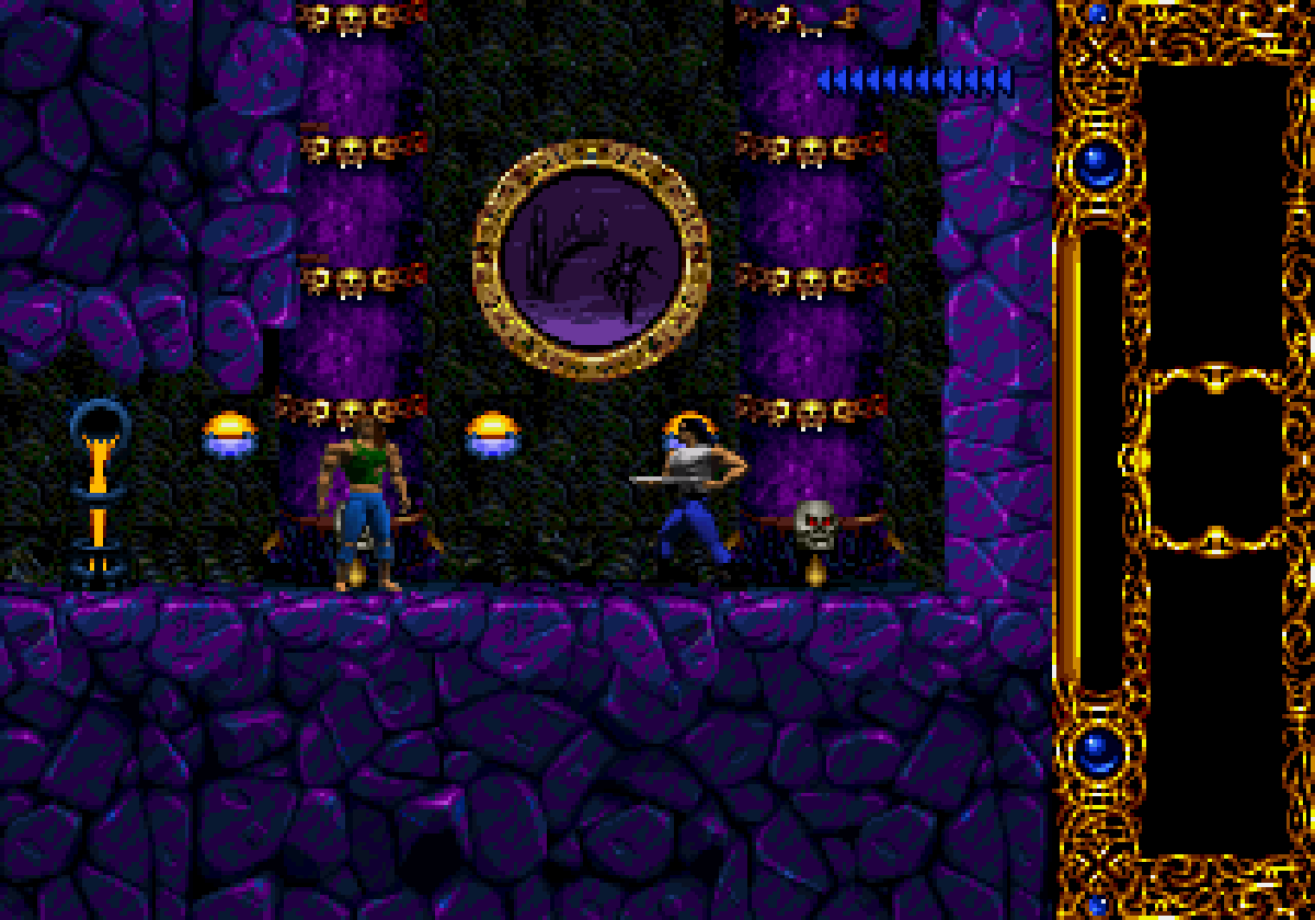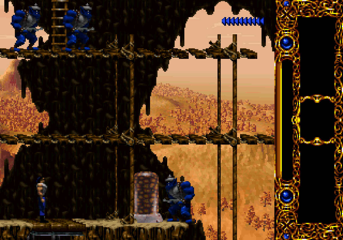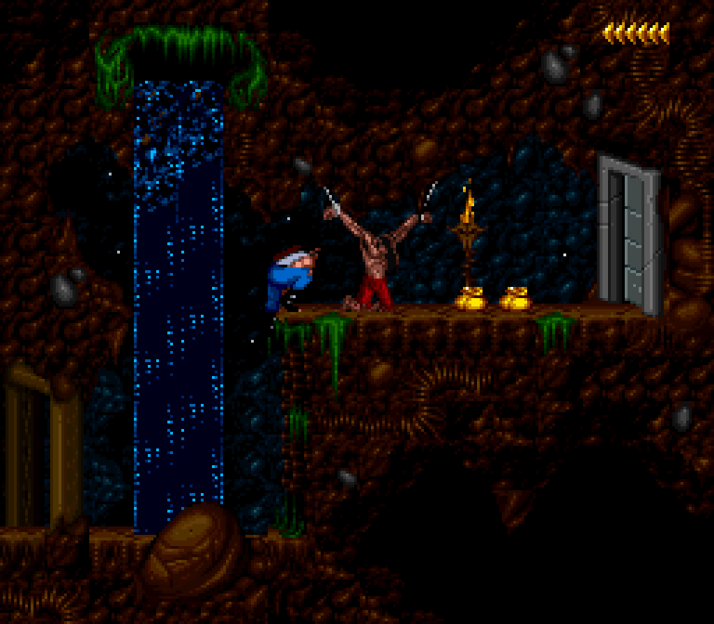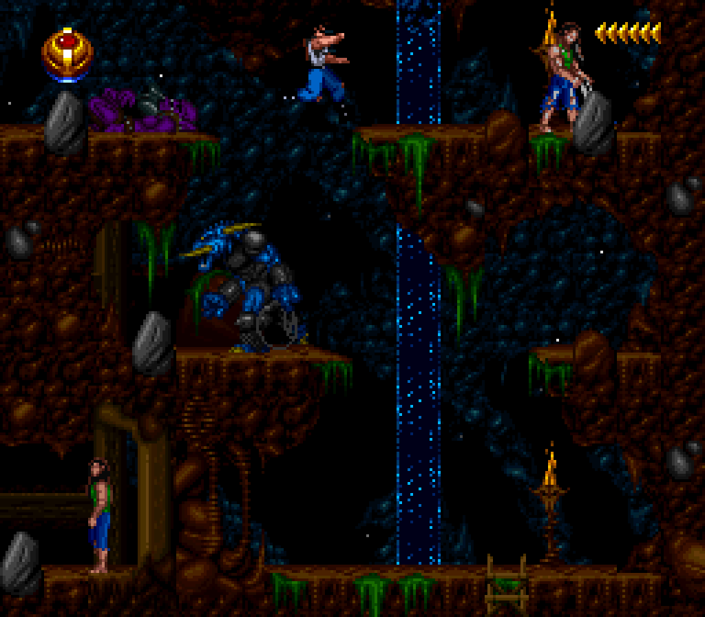 La version Super Nintendo est tout à fait honorable mais... pourquoi est-elle si sombre ?! plusieurs subtilités viennent contrecarrer cette diffamation, à commencer par le système de combats, qui se veut plus tactique encore que dans Flashback et sans bouclier rechargeable (Kyle a pour lui des potions de revitalisation). De plus, se plaquer contre le mur n'empêche pas d'être attaqué au corps à corps, alors que de son côté, notre héros en est incapable (absurde pas vrai ?). Bien sûr, si on meurt, on repart au dernier checkpoint, checkpoint où on nous livre un password. En effet, le jeu étant relativement long (7 à 9 heures tout de même, c'est vraiment pas mal), à chaque niveau (ou sous-chapitre d'un même monde si vous préférez) nous obtenons un code. Etant donné que les objets sont pensés pour être utilisés à bon escient, généralement au passage d'un niveau à l'autre, on n'y perd pas grand-chose. Et si jamais vous vous retrouvez bloqué parce qu'il vous manque un objet (généralement c'est la mort d'un ennemi qui vous les fournit, comme ces bombes qui permettent d'exploser des portes), la solution restante sera de recommencer au dernier checkpoint.