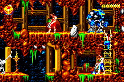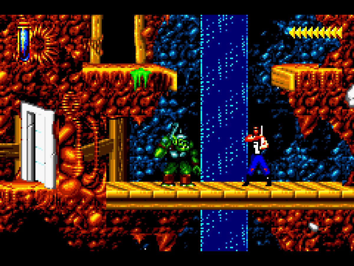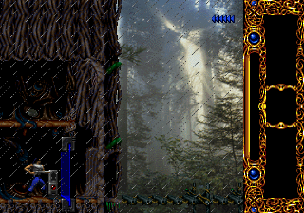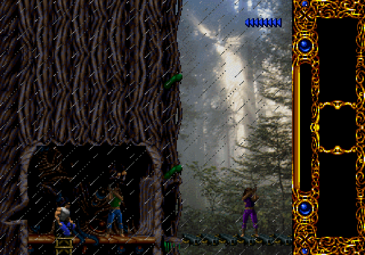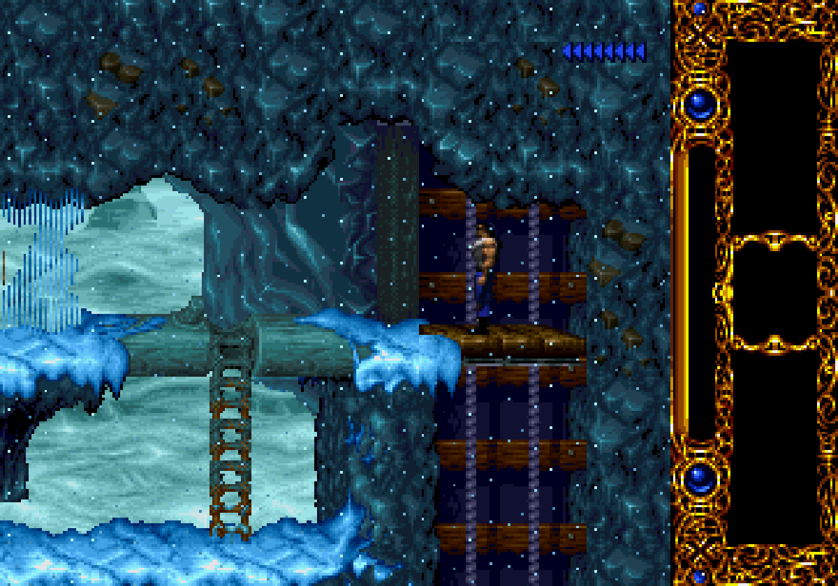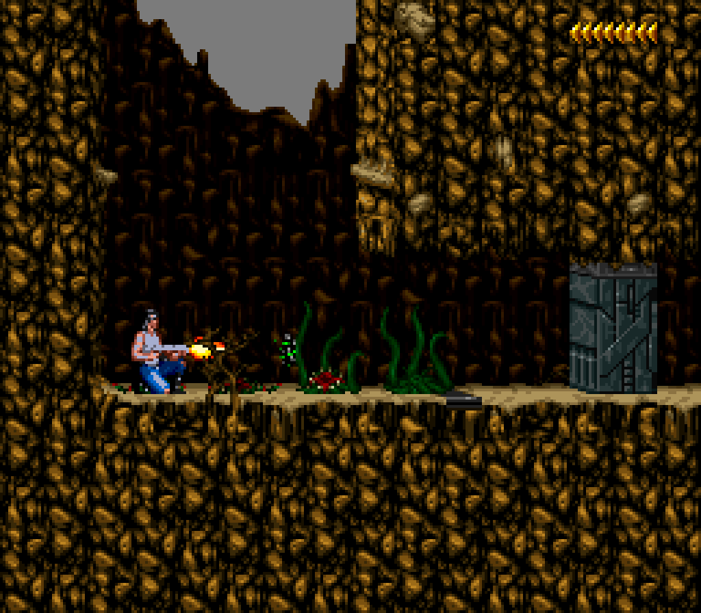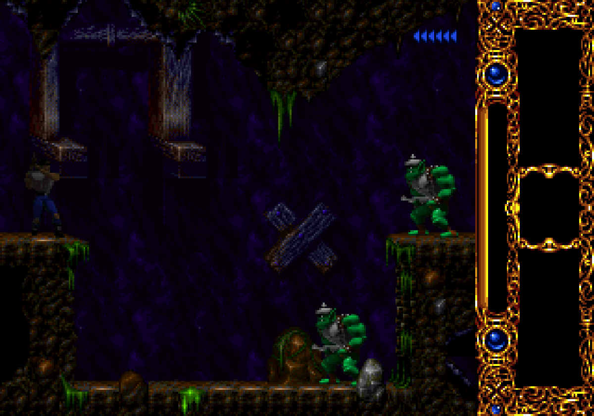 La version Super Nintendo est tout à fait honorable mais... pourquoi est-elle si sombre ?! plusieurs subtilités viennent contrecarrer cette diffamation, à commencer par le système de combats, qui se veut plus tactique encore que dans Flashback et sans bouclier rechargeable (Kyle a pour lui des potions de revitalisation). De plus, se plaquer contre le mur n'empêche pas d'être attaqué au corps à corps, alors que de son côté, notre héros en est incapable (absurde pas vrai ?). Bien sûr, si on meurt, on repart au dernier checkpoint, checkpoint où on nous livre un password. En effet, le jeu étant relativement long (7 à 9 heures tout de même, c'est vraiment pas mal), à chaque niveau (ou sous-chapitre d'un même monde si vous préférez) nous obtenons un code. Etant donné que les objets sont pensés pour être utilisés à bon escient, généralement au passage d'un niveau à l'autre, on n'y perd pas grand-chose. Et si jamais vous vous retrouvez bloqué parce qu'il vous manque un objet (généralement c'est la mort d'un ennemi qui vous les fournit, comme ces bombes qui permettent d'exploser des portes), la solution restante sera de recommencer au dernier checkpoint.