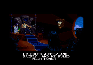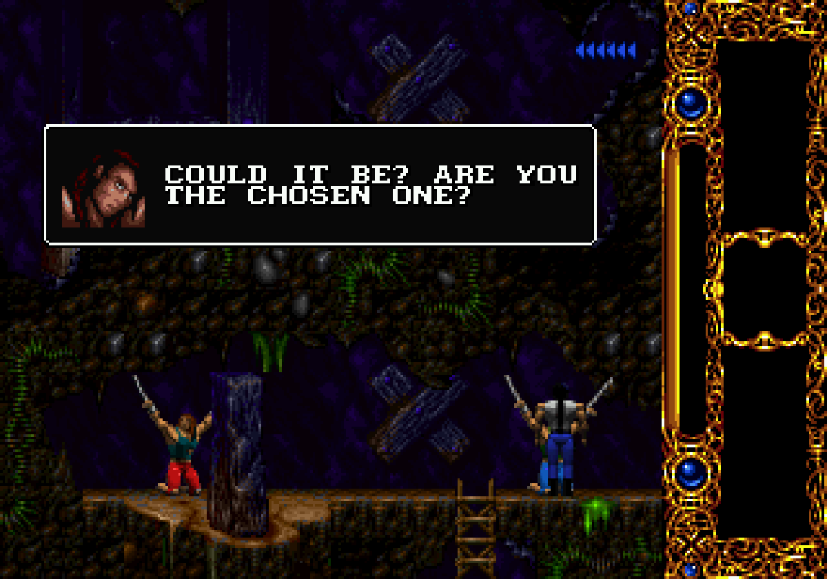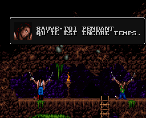 La narration est donc d'un excellent niveau et malgré la taille de la cartouche originelle (8 Mb sur Super Nintendo, ce qui est finalement très peu pour un jeu sorti en 1994), il est clair qu'il ne manque rien ! De plus, en se plaçant devant un PNJ et en pressant "haut" on peut dialoguer avec lui, ce qui apporte encore un peu plus de profondeur à l'écriture. Je regrette juste que Kyle ne puisse pas libérer ses frères enchainés... un acte qui aurait été tout à fait naturel étant donné sa position de héros "élu" et de libérateur.