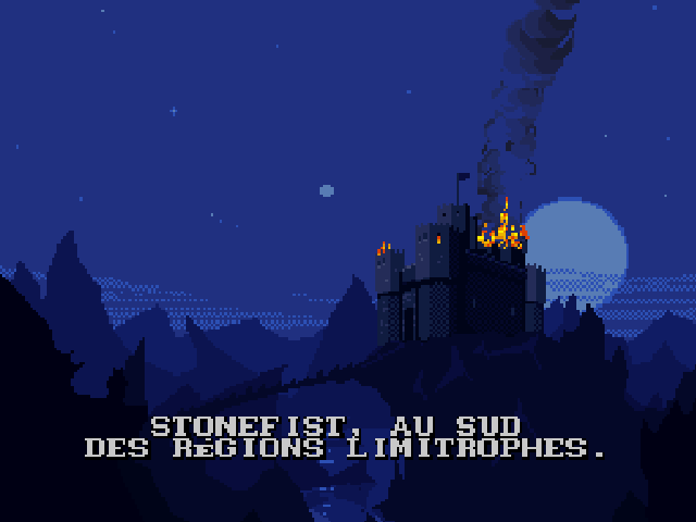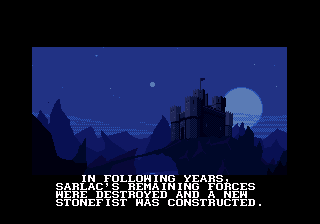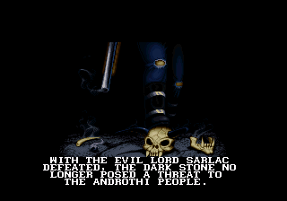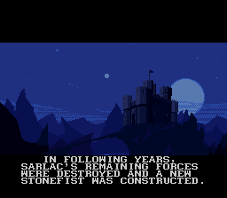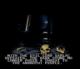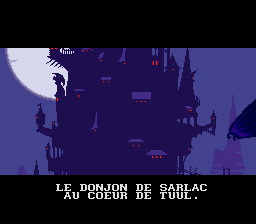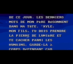 Seule la version Super Nintendo profite d'une traduction française... afin de résoudre le dilemme, il partit dans le désert et se tua. Son corps se changea en 2 pierres : une de lumière et une des ténèbres, et chaque fils en prit une. Le peuple de la "pierre de lumière" fonda le royaume d'Androth, le peuple de la "pierre des ténèbres" celui de Ka'dra'suul. Alors que le peuple d'Androth respectait sa pierre, ceux de Ka'dra'suul la rejetèrent, et elle les transforma en monstres. Sarlac, le chef de Ka'dra'suul, leva alors une armée pour attaquer Androth. Sachant son peuple condamné, Vlaros (le roi d'Androth), décida d'envoyer son fils Kyle sur un autre monde, afin de lui sauver la vie, sachant que son royaume subissait un siège et que la fin était proche.