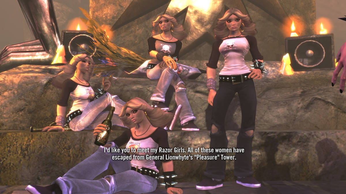 Quant aux clins d'œil, ils inondent le jeu ! Commençons par le fait que le gardien du métal ne soit personne d'autre qu'Ozzy Osbourne ou encore que le guérisseur ne soit autre que Lemmy Kilmister (Motörhead), et vous comprendrez qu'on baigne jusqu'à la pomme d'Adam dans le rock, le vrai. Dans le casting (notamment vocal) on retrouve aussi de gros monstres, peut être un peu moins connus (quoique) mais aussi bons, tels que Rob Halford ou Lemmy Kilmister. Et la première force de Brütal Legend est là : on ne nous parle pas de rock sans mettre les 2 pieds dans le plat. Car bien des jeux sont comme ça, ils n'exploitent pas leur potentiel, leur background, mais ici c'est tout le contraire, on mange du heavy metal à toutes les sauces et bon sang ce que ça fait du bien !