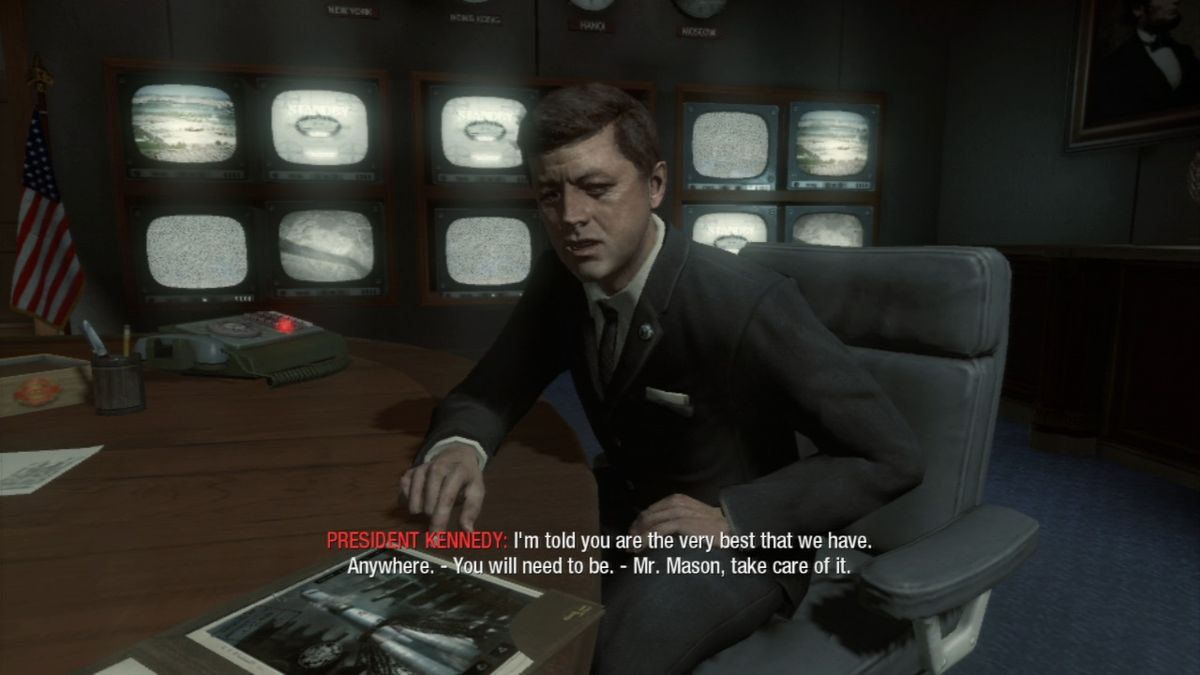 Durant la Guerre Froide, la première mission de Mason est de tuer Fidel Castro, lors que la tristement célèbre "crise des missiles de Cuba" : 1962, des missiles nucléaires soviétiques pointés sur le territoire des États-Unis depuis l'île de Cuba, a placé le monde au bord d'une guerre nucléaire. Du coup le jeu a été interdit sur l'archipel, puisque de nombreuses tentatives de ce genre ont réellement existées et le gouvernement cubain ne veut pas que ça fasse de vagues. Ensuite on poursuivra notre périple en URSS, pour continuer au Vietnam en 1968 (et on retrouve même un peu de nazis... ils sont fans ou quoi ? décidément ils ne peuvent pas s'en empêcher !). Directement inspiré de Modern Warfare et de sa tension quasi permanente, Black Ops nous assène scène épique sur scène épique, dans un réel festival d'explosions, un déluge de balles et une scénarisation qui tient remarquablement la route. Bien sûr ça sent le déjà-vu, au moins 2 fois, mais force est de reconnaitre que la formule séduit à nouveau. Et dans tout ça, on appréciera quelques jolis clins d'œil aux faits historiques, comme être briefé par le Président Kennedy en personne, ou encore la surprenante (bien qu'un poil prévisible) scène finale et son retournement de situation.