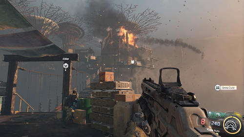 Notre personnage "augmenté" aura diverses facultés (comme ici contrôler un drone à distance) mais ça reste finalement assez gadget au piratage à distance, il permet de prendre le contrôle d'une tourelle ou créer une surcharge des androïdes qui ensuite exploseront... Oui, c'est le futur et nous n'affronterons pas que des humains (augmentés ou pas), mais aussi une palanquée de robots plus ou moins gros et plus ou moins agressifs. Faire ses petites emplettes est vraiment sympa mais une fois le matériel à fond (aux alentours de la moitié du jeu), il perd forcément de son intérêt. De plus, c'est bel et bien le fait de revenir à chaque fois au QG, qui va littéralement casser le rythme ! Black Ops III propose de très bons passages, mais on ne retrouve pas ce rythme mené tambour-battant qui sied si bien à la série.