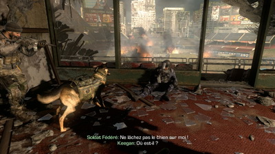 Retour dans notre bon vieux mode Campagne, Call of Duty Ghosts nous propose quelques nouveautés, noyées au milieu d'un océan de classicisme ! De temps en temps on contrôlera Riley, le chien, qui n'est ni plus ni moins qu'un drone. D'ailleurs ce n'est pas un simple chien, c'est un véritable vélociraptor (!) tant la boule de poils peut s'avérer agressive et efficace au combat. Lorsqu'on n'en prend pas directement le contrôle (dans des phases d'infiltration dirigistes qui valent ce qu'elles valent), on pourra l'envoyer attaquer un mec : au pire il l'immobilisera, au mieux il lui réglera son compte. Au final, ce qui partait d'une bonne idée se révèle assez anodin, assez gadget et baser une partie de la com' là-dessus, c'était peut-être mal jouer ses cartes.