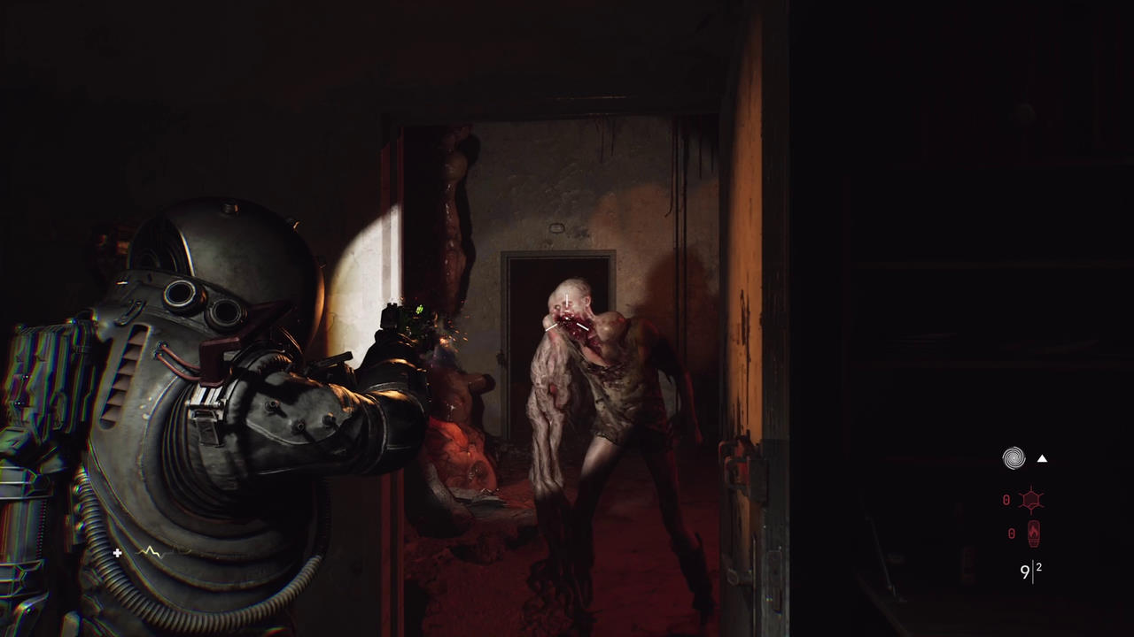 Et Dead Space n'est pas le seul : Resident Evil, Singularity, Bioshock... la Bloober Team a pioché ses idées un peu partout très cloisonné et dirigiste, l'exploration est toujours gratifiante, voire même salvatrice car il faudra récupérer un max de ressources (énergie, produits chimiques et pièces détachées avant toute chose) qui ont une grande utilité. En effet, dans un sous-menu dédié, on pourra alors concevoir des munitions et des soins. Et tout le dilemme est là : l'inventaire est un enfer à gérer, les ennemis encaissent beaucoup trop (alors que les munitions trouvées en chemin sont rares) et forcément, on a aussi besoin de réparer son armure. Dans les "safe room" on retrouvera donc le fameux coffre, une borne pour sauvegarder, mais aussi un atelier où on pourra upgrader ses armes (puissance de feu, recul, chargeur...) ainsi que son personnage (santé et surtout taille de l'inventaire !). Pour ça il faudra investir des points d'upgrade (qui sont très rares, au moins autant que les "points de force" de Dead Space) ou revendre son surplus (notamment des objets rares trouvés ça et là qui n'ont qu'une utilité : les revendre pour faire des sous) afin de se payer de précieuses mises à jour.