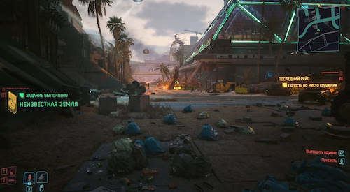 Dogtown n'est pas une zone dépaysante, au contraire ! C'est un vrai dépotoir, un bidonville où il ne fait pas bon vivre... première chose à savoir, c'est que l'histoire de Phantom Liberty ne se déroule pas après l'aventure principale mais bien pendant celle-ci. De toute façon, le jeu fera en sorte d'activer ce contenu au moment opportun et mélangera les missions de Phantom Liberty à celles qui restent à faire dans Night City. Si jamais vous avez déjà essoré le jeu plusieurs fois et que vous n'en pouvez plus du centre ville ou des badlands, Cyberpunk vous propose aussi de commencer directement par Phantom Liberty, avec un leveling automatique, quelques compétences déjà acquises et bien entendu un équipement de base. Prendre ce raccourcis serait selon moi une erreur mais tous les goûts sont dans la nature il parait. Moi-même, j'ai attendu que sorte le DLC pour me refaire le jeu de base, après plus de 2 ans d'attente et un nombre incroyable de patches que j'ai vu passé dans ma liste de mises à jour automatiques.