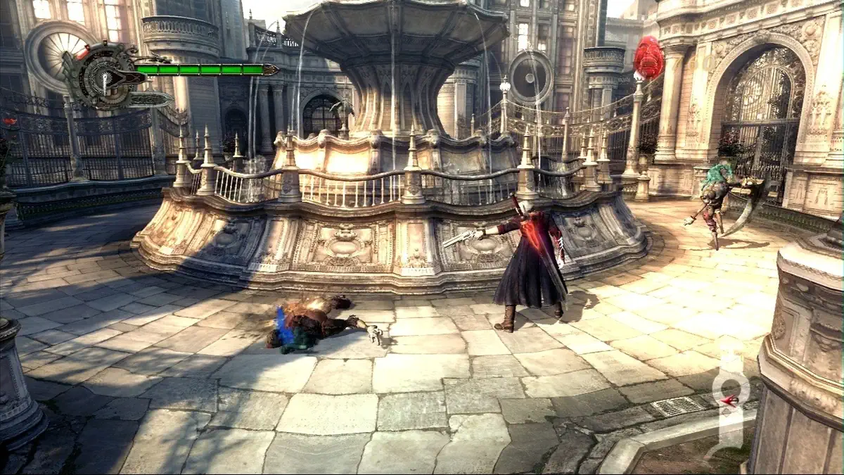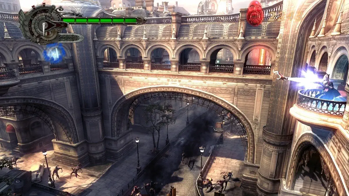 Petite nouveauté bien pensée : une mini-carte s'invite à l'interface graphique (HUD) et nous propose une agréable vue succincte du lieu (une vue d'ensemble est aussi disponible dans le menu pause) et nous évite ainsi de nous perdre. Entre 2 combats, on retrouve les éternelles phases de plate-formes, partie intégrante de la saga. Une nouvelle fois assez simples, à part 2~3 passages un peu plus délicats, elles ne sont là que pour varier un peu le gameplay. Evidemment la jouabilité excelle dans son imprécision et la gestion de la caméra est toujours un peu cripsante (heureusement, on peut la recaler avec le stick droit). Et oui, "formule DMC" oblige, les sauts sont très approximatifs et la caméra passe souvent sous un angle très mal choisi.