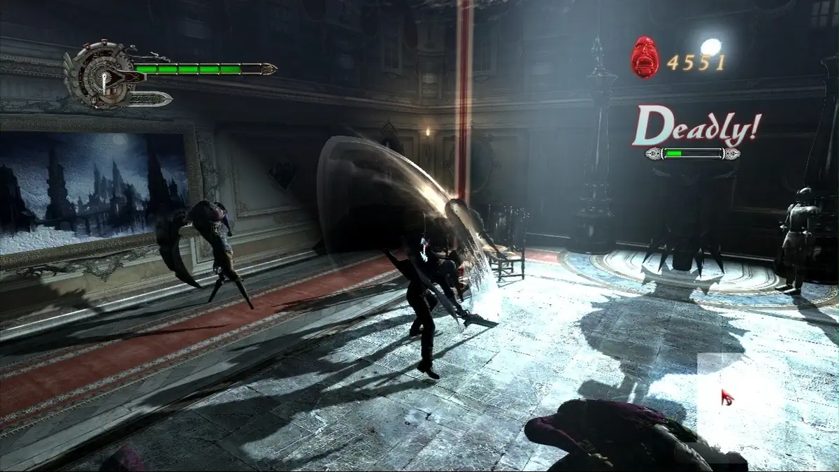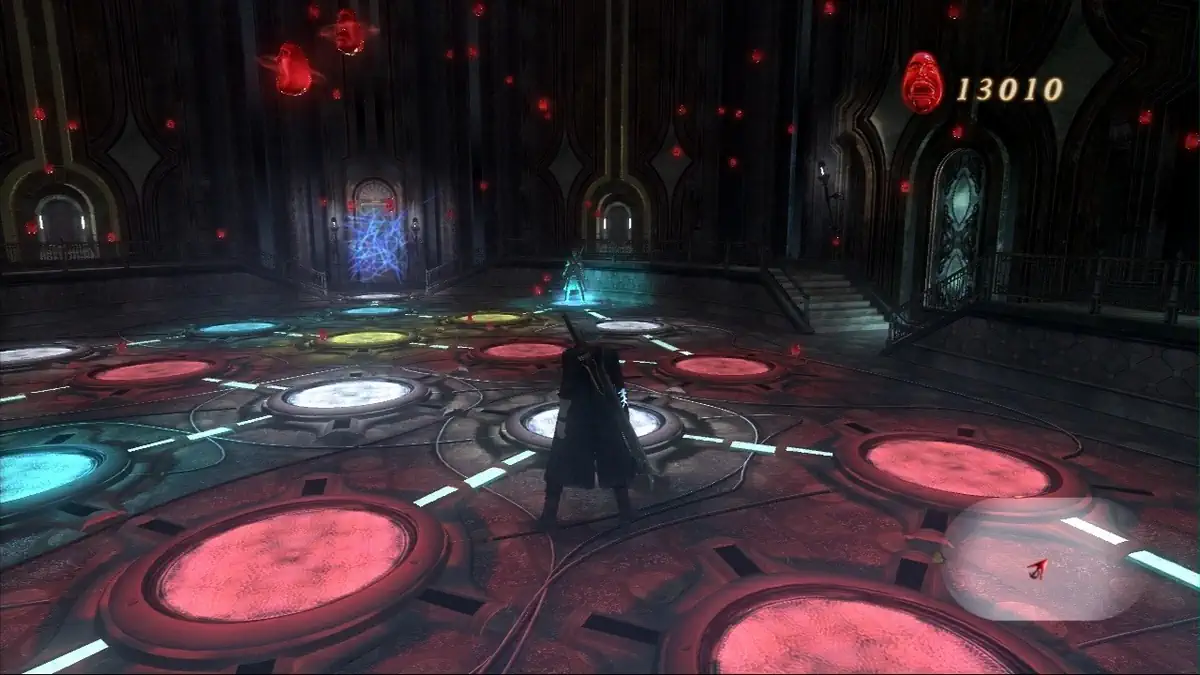 Comme avec Dante, il sera possible de faire des emplettes. Avec les orbes rouges on achète des objets (comme les artéfacts qui remontent la santé) et avec les âmes fières (plus rares) on pourra débloquer de nouvelles techniques et ainsi upgrader ses capacités (bien que ça serve à peine, la puissance brute n'évoluant que très peu). La Red Queen (l'épée) peut être chargée pour faire plus de dégâts (elle est équipée d'un mécanisme mais finalement ça tient plus du gadget qu'autre chose) et on pourra avoir par exemple, le tir chargé pour le flingue (lui aussi une fois upgradé, sa supériorité est grandement remise en question).