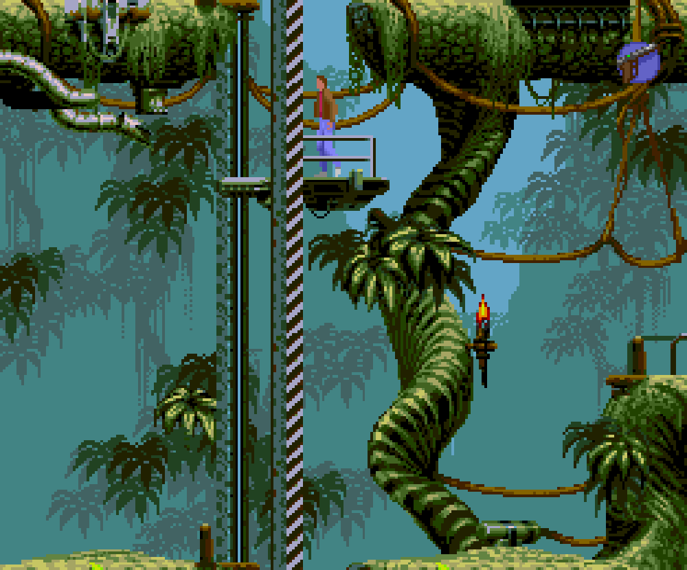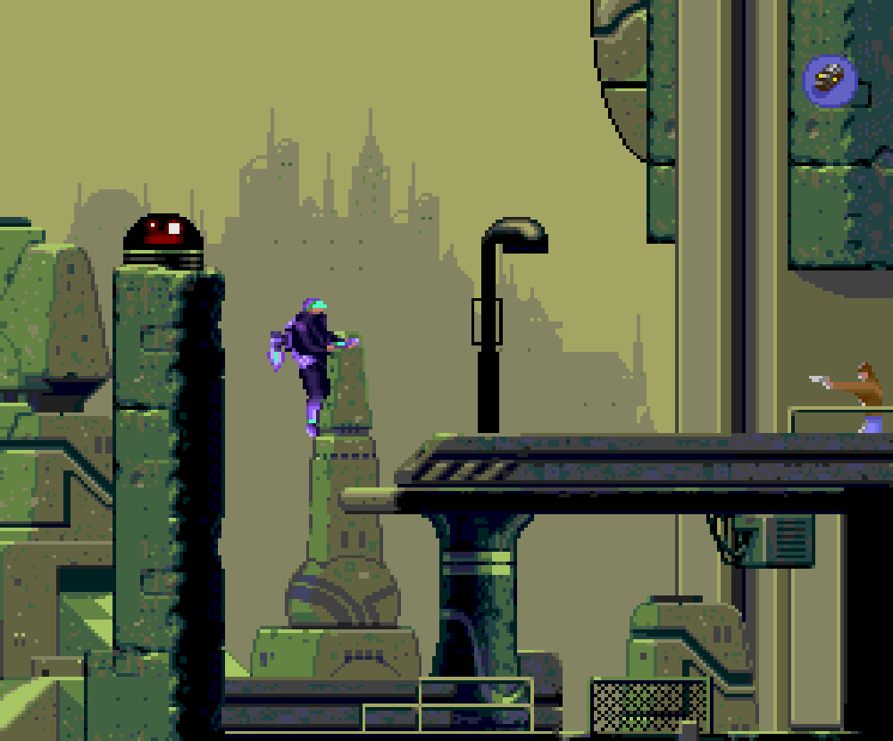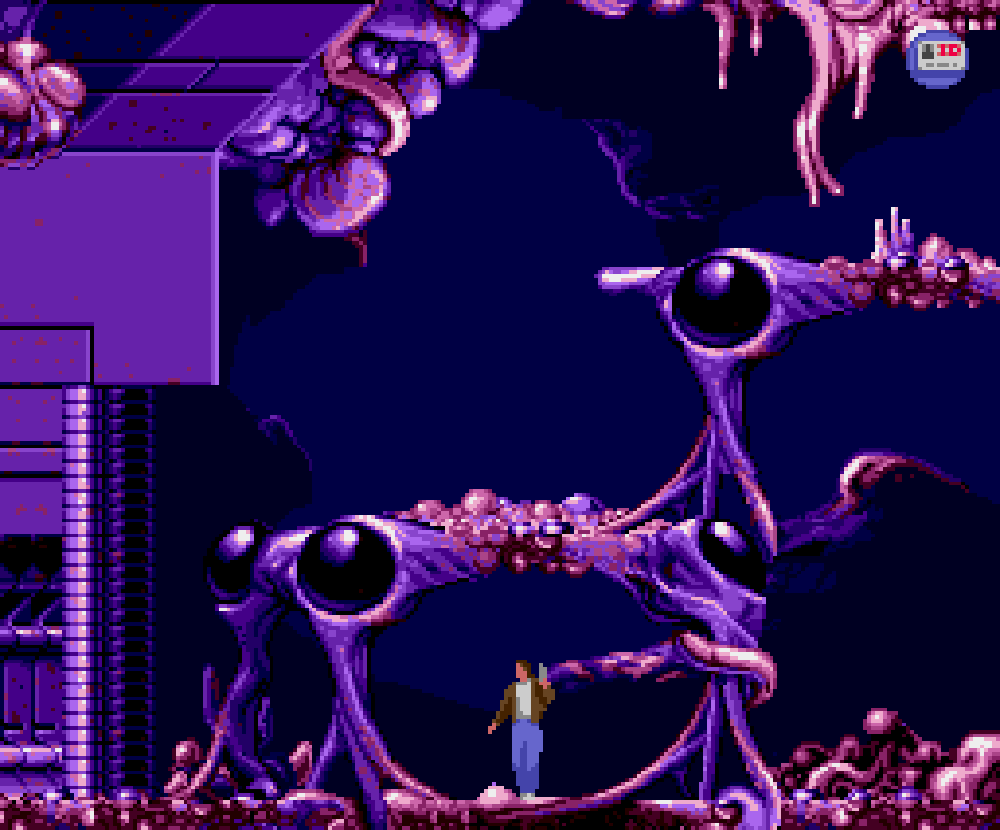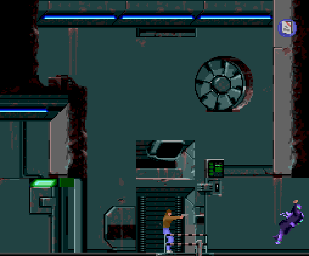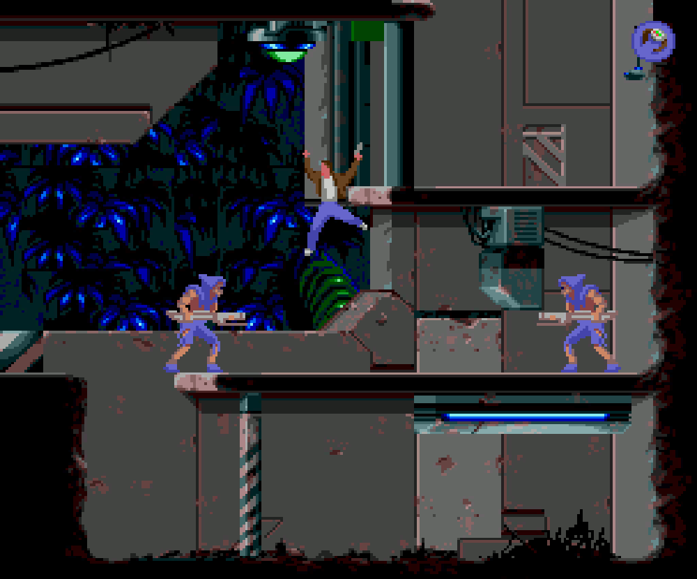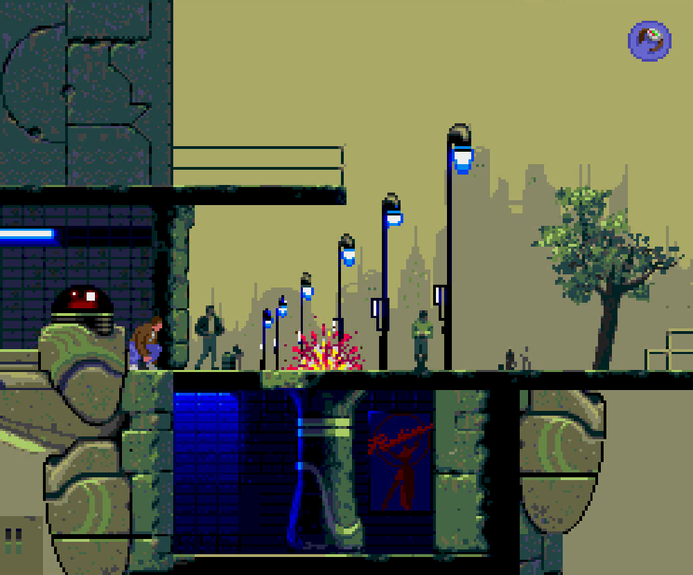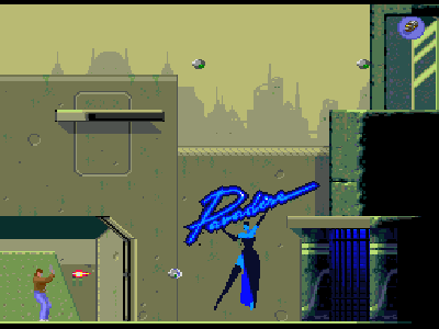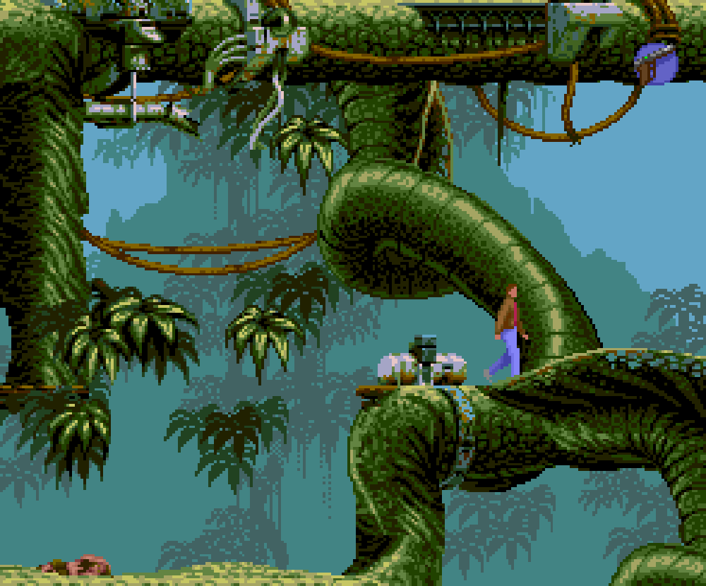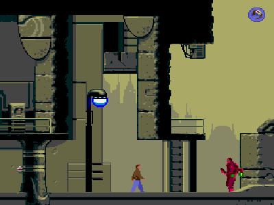 C'est assez flagrant dans le niveau de jungle, plus encore sur la planète des Morphs, qui semblent plus organiques et qui maquillent parfaitement ce gameplan qui peut sembler un peu trop perpendiculaire. C'est évidemment moins le cas dans les zones urbaines ou la Death Tower, mais après tout, on n'y fait guère attention. Les décors, même si quelques passages sont un peu vides, possèdent leur design et leur atmosphère propre, ainsi qu'une bonne définition et une bonne coloration. Comme quoi, malgré les limitations du support de développement (rappelez-vous qu'à l'origine, le jeu devait avant tout sortir sur Mega Drive), Delphine Software a été capable de nous sortir de très belles images. De plus, la direction artistique est très futuriste, très hi-tech, et aujourd'hui on la rapprocherait facilement du style cyberpunk... les augmentations en moins.