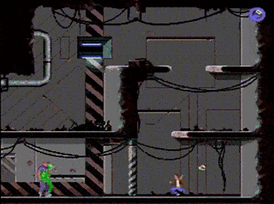 En plus des ennemis et d'un level design parfois retors, il y a aussi beaucoup de pièges qui nous tuent en un coup Flashback on court rarement, dans la plupart des cas, on avance doucement, on fait attention où on met les pieds et les phases d'ascension ou de descente, s'effectue dans la plus stricte rigueur. En effet, visant à être réaliste (autant que possible), une mauvaise chute peut causer une mort instantanée, sans que le bouclier puisse y faire quoique ce soit. De même, si on évite de courir comme un dératé, c'est aussi parce que les niveaux sont jonchés de pièges qui nous "one shot" (on assiste alors à la fameuse séquence verdâtre où Conrad se fait dissoudre... et c'est sans doute la cinématique que vous verrez le plus souvent !). Pour l'aider dans cette aventure où il est seul au monde (le gars doit sauver l'humanité mais à part son pote Ian, personne ne l'aide... faut dire qu'en théorie, personne n'est au courant) notre super héros 100% humain disposera de quelques gadgets bien utiles.