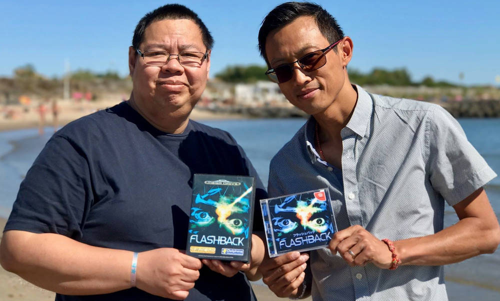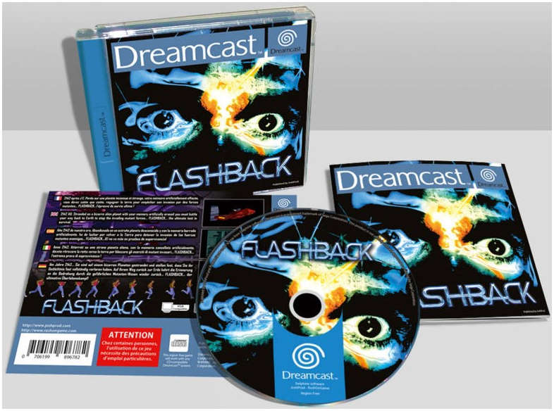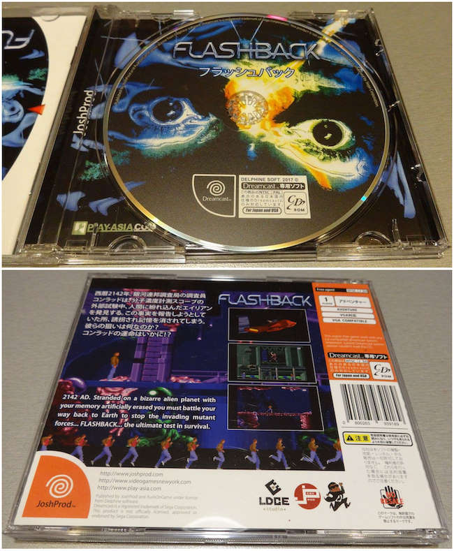 C'est une nouvelle fois JoshProd qui est derrière ce portage. D'ailleurs son producteur (à droite) prend la pose avec Paul Cuisset (cliquez pour agrandir) le jeu ne tient pas sur un GD-Rom classique mais sur un MIL-CD (comme tous les jeux indépendants sortis sur DreamCast), à savoir un CD-Rom hybride, qui pourrait ne pas être compatible avec certains modèles de consoles (notamment les plus récentes, qui disposaient d'un meilleur système anti-piratage). Au final, si tout ceci est rendu possible, c'est parce que la 128-bits de SEGA dispose d'un double système d'exploitation : SegaOS et Windows CE, et on ne va pas se mettre des œillères, si ce genre de portage existent, c'est grâce à cette version bien particulière de Windows. Mine de rien SEGA a eu le nez fin avec cet OS car c'est grâce à lui que sa console vit encore, tant d'années après son arrêt prématuré et qu'elle est l'une des plus apprécié de la scène Indépendante. Ayant vu le jour en novembre 2017, plus ou moins 1 an avant son ultime portage sur PS4/Switch/Xbox One, on peut même imaginer que c'est cette version de Flashback qui a incité Microïds et Paul Cuisset à réaliser le Remaster officiel.