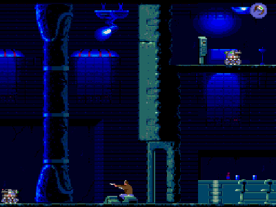 Par contre, là où Delphine Software a rendu son jeu moins hardcore, c'est que notre héros est également équipé d'un bouclier rechargeable. Ainsi avant de mourir, il peut d'abord encaisser 4 tirs ennemis, ce qui mine-de-rien, est loin d'être un luxe. Comme évoqué, Flashback est avant tout un platformer mais loin d'être un jeu plate-formes comme tout ceux inspirés de Super Mario Bros, ici on nous demande énormément de précision. Je l'ai déjà dit, le jeu est comme "quadrillé" ainsi chaque pas, chaque mouvement, vous mènera toujours à une position exacte, un emplacement précis de chaque tableau (ce qui n'était pas le cas d'Another World soit dit en passant).