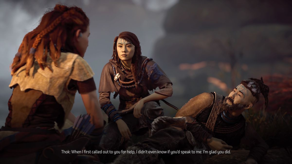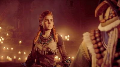 Question mise en scène, c'est Ashly Burch qui tient le rôle d'Aloy, une jeune actrice américaine née en 1990 et qui a beaucoup participé au jeu vidéo (Borderlands 2, Life is Strange, Fallout 4, Mortal Kombat X, Rise of the Tomb Raider et bien d'autres). Car vous le savez sans doute, pour éviter d'avoir des cut-scènes où s'agitent des poupées aux animations robotisées, il n'y a rien de tel qu'une bonne Motion Capture. Et ça se voit très vite dans Horizon, tant les expressions faciales, les modélisations et la scénographie s'avèrent particulièrement travaillées. D'ailleurs, à l'image du vétéran The Witcher 3, on peut dire que le jeu est particulièrement scénarisé, travaillé et même détaillé car il y a pas mal de documents à lire et à écouter (grâce à son Focus, Aloy est capable de décoder les vestiges de l'ancienne civilisation).