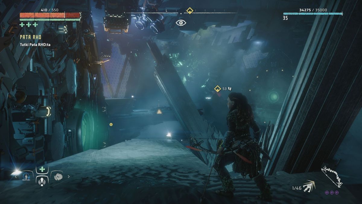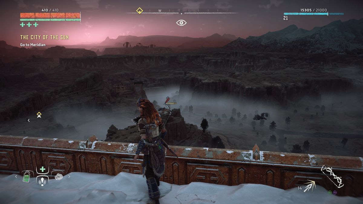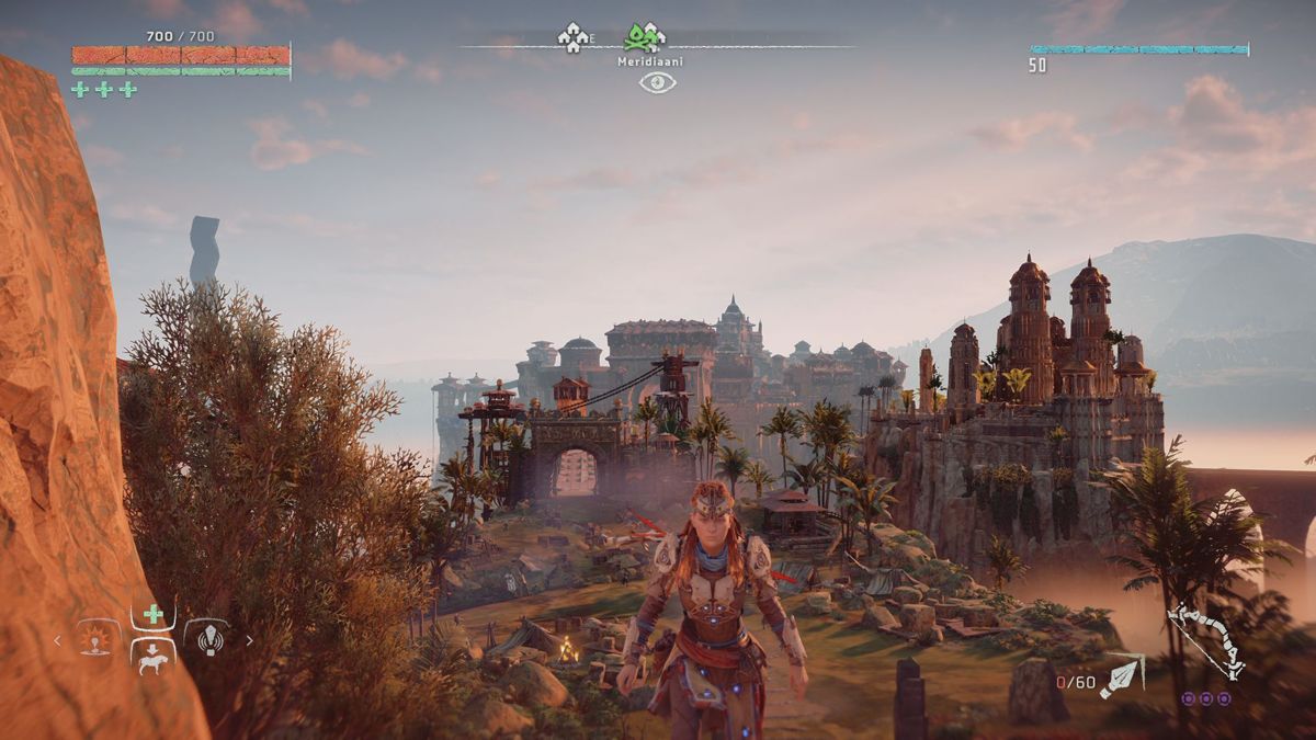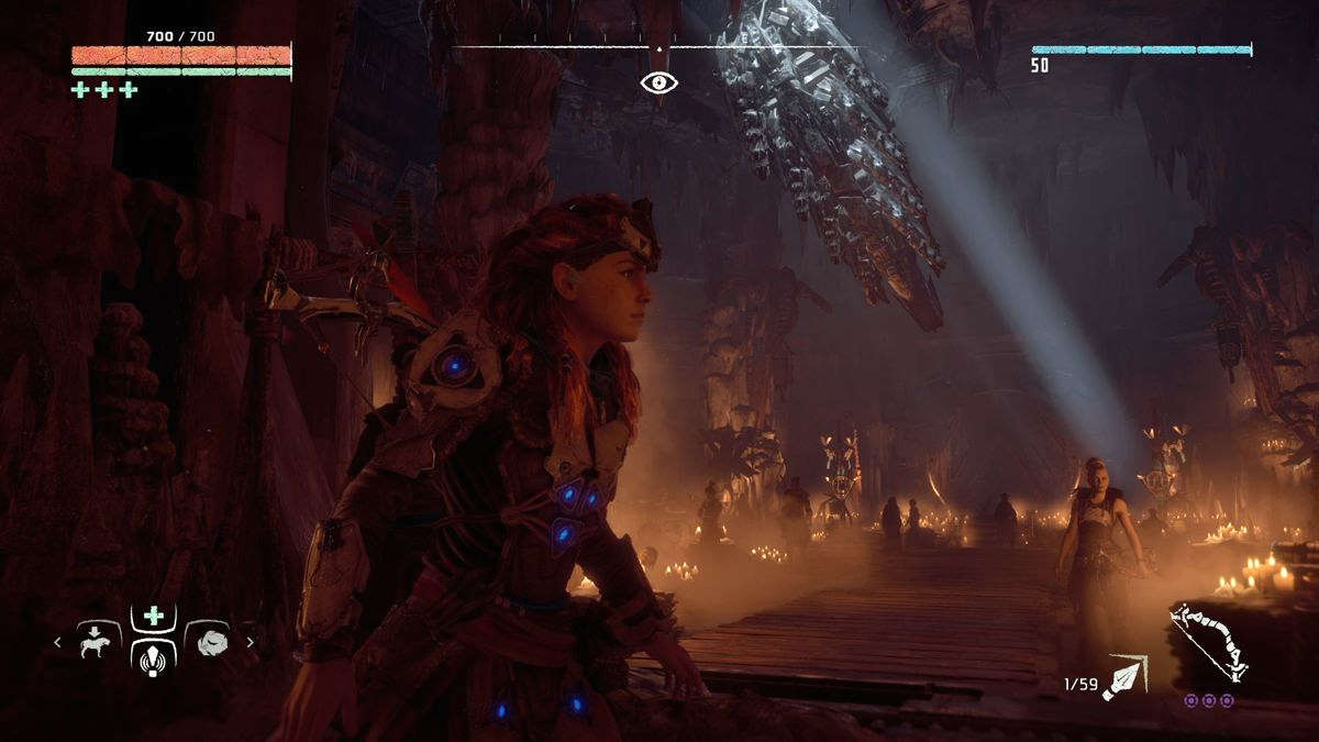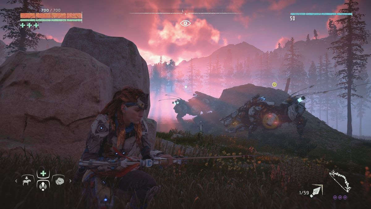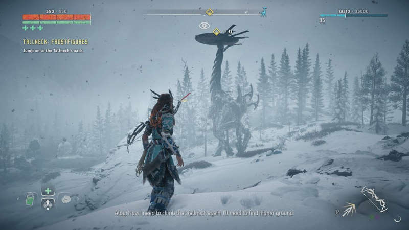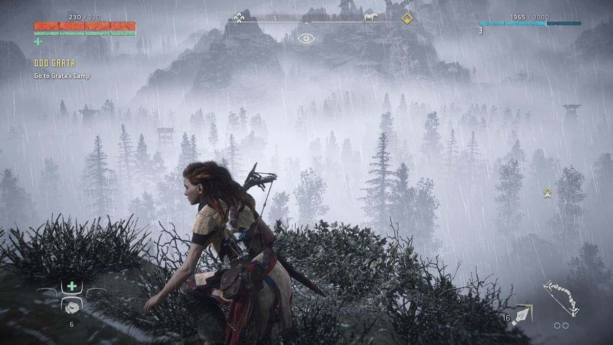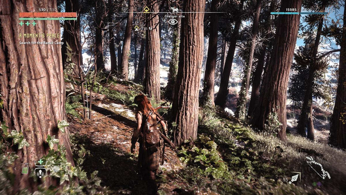 Par exemple, on récupérera divers matériaux et plantes afin de se soigner (Far Cry) et de créer ses propres flèches (Tomb Raider). Très habile, Aloy peut grimper (presque) partout et ne se laisse pas arrêter par une petite côte ou un pan de mur (Assassin's Creed), la grimpette fait d'ailleurs partie intégrante du gameplay, et celle-ci se trouve particulièrement assistée (Uncharted), idem pour les passages en tyrolienne ou en funambules, ou encore les descentes en rappel (Tomb Raider). Au milieu des missions qu'on doit accomplir, il y a aussi des camps à "nettoyer" de ses ennemis, la map et son fonctionnement (ou encore le fait de jeter des cailloux pour attirer l'attention ailleurs) nous ramènent immanquablement à Far Cry.
