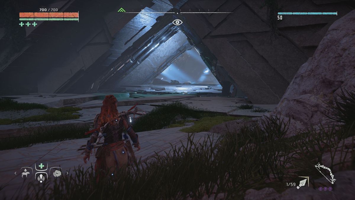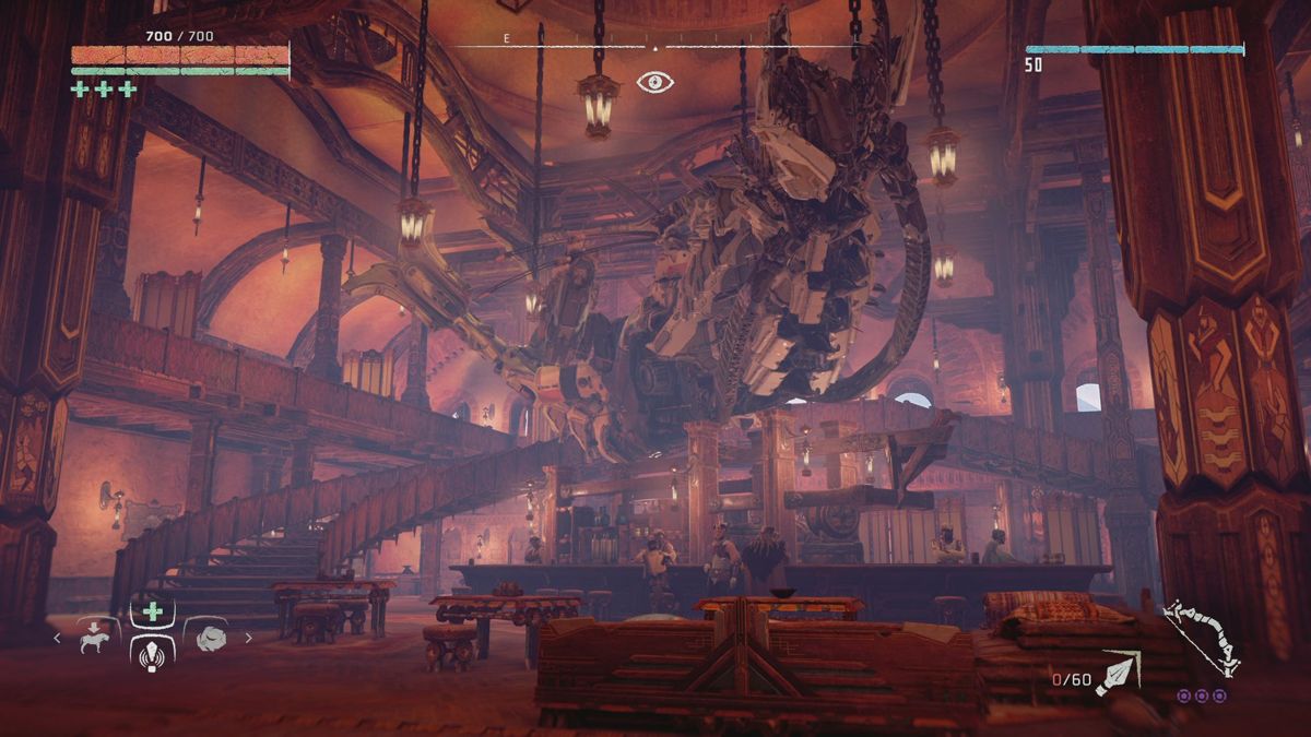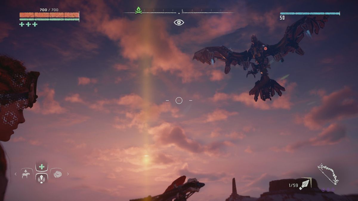 Bien entendu on trouvera d'autres armes (comme un arc de précision, un autre permettant de lancer des flèches spéciales, une fronde ou encore une sorte d'arbalète pour poser divers pièces), il sera même possible de récupérer quelques grosses pétoires laissées par les gros durs des camps... mais au final, c'est bien l'arc de base qui est à l'honneur. D'ailleurs on sait tous qu'elle est la première particularité de cette arme : l'élimination silencieuse. Et en effet, dans le monde d'Horizon, la discrétion est une vertu tant les machines (comme les ennemis humains) peuvent être agressives. Ainsi il vaut mieux réaliser des exécutions discrètes et lancer quelques flèches bien placées, afin de ne pas trop attirer l'attention.