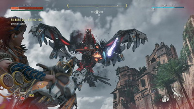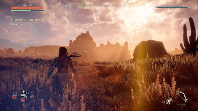 un paquet de fois pour son écriture, sa bande-son ou la qualité de sa réalisation (mais relégué à la seconde place, souvent au profit d'un certain Legend of Zelda : Breath of the Wild), au sein de Guerrilla, l'idée d'Horizon est née dès la fin du développement de Killzone 3. Pourtant, autant j'apprécie les Killzone, autant je trouve que le développeur néerlandais n'a jamais su l'exploiter convenablement, notamment à cause de scénarios franchement bidons et d'un univers extrêmement riche et fort, mais clairement sous-exploité. Ajoutons à ça notre propre expérience sur Far Cry Primal et le fait que globalement, notre héroïne aura pour arme principale un arc (nous qui aimons tant les gros flingues), et c'est sûr, on partait avec un sérieux bagage de préjugés et d'inquiétudes en tout genre. Et pourtant, une fois le jeu lancé et dès cette longue et belle introduction, on a bien senti que Guerrilla avait mûri, qu'il avait pris leçon de ses erreurs passées. Bien sûr le jeu n'est pas parfait, car il est toujours difficile de passer d'un FPS bourrin et couloir (Killzone), à un jeu d'aventure en vue à la 3e personne, avec un gros aspect RPG et du crafting, le tout en open-world. On le voit par exemple dans la gestion, assez catastrophique, de la caméra lors des combats au corps-à-corps, où la lisibilité est quasi nulle ! Ou encore ces ennemis, franchement agressifs et qui attaquent en meute, rendant la progression parfois pénible.
