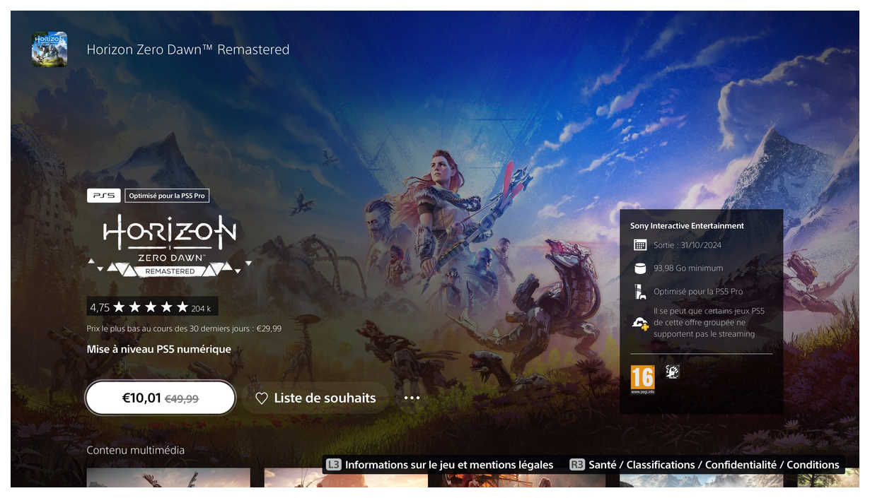 Horizon Zero Dawn est l'un des plus beaux jeux de la PS4 et de la PS4 Pro. Sur PS5, il sera encore plus détaillé et fluide, passant à du 4K / 60 fps ceux qui n'ont pas d'écran compatible et qui resteront en Full HD / 1080p, le jeu utilisera le supersampling, une technique permettant de produire des textures à une résolution proche de la 4K avant de les réduire en 1080p, ce qui fait que les graphismes paraitront plus fins et détaillés. Enfin, un filtrage anisotrope améliorera la finesse des textures et le HDR permettra d'obtenir (si votre téléviseur est compatible) des couleurs plus naturelles. Bref, si le jeu est déjà très beau sur PS4, dites-vous que l'achat de votre PS4 Pro n'aura pas été inutile et que vous profiterez au mieux du titre de Guerrilla. Quant à la PS5, son patch fut déployé en avril 2021, soit près de 4 ans après le lancement du jeu, 5 mois après le lancement de la console. Etant donné les débuts difficiles de la machine de Sony (comme celle de Microsoft au même moment), la rétro-compatibilité améliorée était clairement la bienvenue.