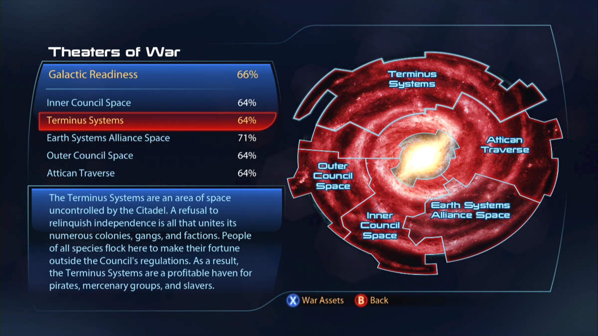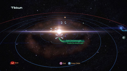 Comme je le disais plus tôt, beaucoup de dialogues se font à l'arrache, et ce tout juste après une mission importante (alors qu'en général, c'était justement l'occasion de discuter). La carte galactique et la recherche de ressources ont également été profondément revues car cette fois, nous avons les Moissonneurs aux fesses ! Pas question de visiter des planètes avec le Mako, pas question non plus de les sonder une à une, cette fois le Normandy émet une sorte d'onde sonar et IDA (l'IA du vaisseau) trouve ou non un résultat. Cette onde déclenche donc des points d'intérêts et si c'est une planète, on la scannera comme dans l'épisode 2.