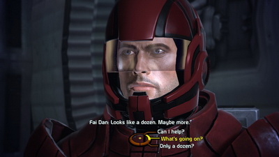 RPG avant tout, le jeu se table sur énormément de dialogues, où le système de réponses dynamiques marche à merveille. La qualité de la réponse (conciliante, neutre ou pragmatique) influe ensuite sur l'histoire. Par exemple draguez 2 filles en même temps, et à un moment ou un autre, vous aurez des comptes à rendre. Mieux encore, certains choix peuvent entrainer la mort prématurée d'un membre de votre équipe. Ainsi, selon votre état d'esprit, vous irez chercher l'action, l'efficacité au détriment de la négociation et de l'empathie. Selon vos choix, vos interlocuteurs vous verront différemment, ce qui ouvre de grandes perceptives pour la rejouabilité de cette aventure. Je me demande d'ailleurs comment BioWare a pu faire tenir autant de dialogues sur un seul disque.