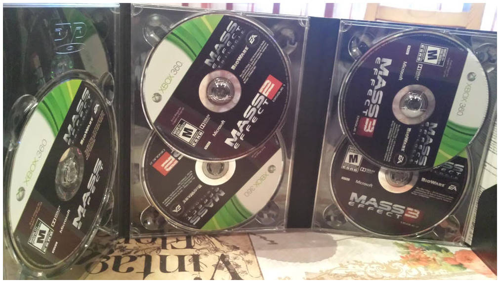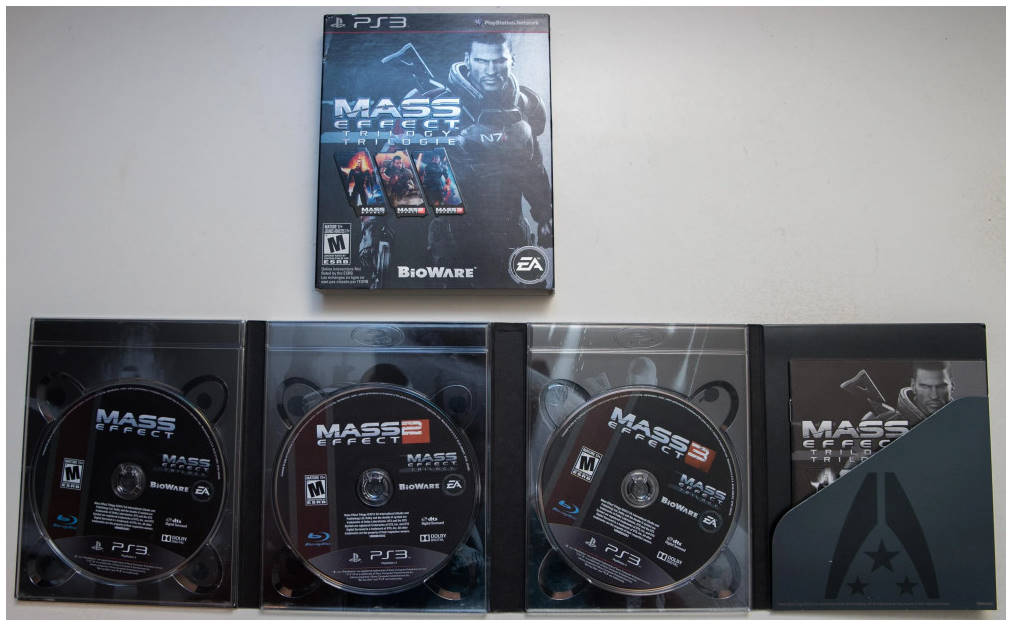 Mais le préjudice sera de courte durée puisque Electronic Arts et BioWare sortiront peu de temps après la Mass Effect Trilogy, sur Xbox 360, PC et PS3. Sur Xbox 360 et PC on retrouve 5 disques (1 DVD pour Mass Effect 1, puis 2 DVDs pour Mass Effect 2 et encore 2 autres pour le 3e opus) alors que sur PlayStation 3 et ses spacieux disques à rayon bleu, nous avons 3 Blu-Rays. Et oui, c'est en effet à la sortie de cette trilogie que la PlayStation 3 a enfin reçu son Mass Effect 1 en édition physique... pas moins de 5 ans après la Xbox 360. Notez enfin que cette Mass Effect Trilogy existe en 2 formats : soit la Collector réunissant les multiples disques en un seul boitier (contenant au passage plusieurs bonus), soit un simple coffret qui contient les 3 jeux distincts. De plus, le prix était tout à fait raisonnable, environ 50€, surtout quand on pense au contenu et à la durée de vie de l'ensemble (ci-dessous, cliquez pour agrandir).