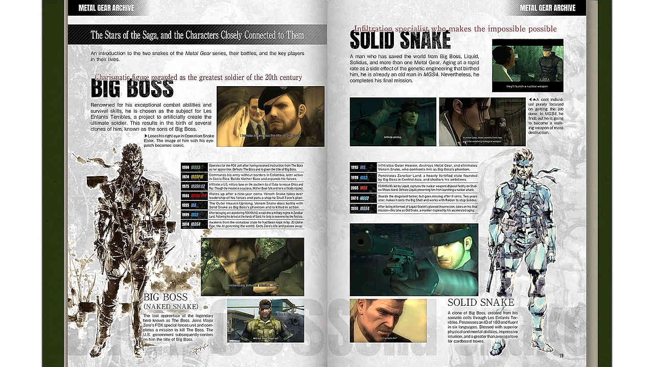 Cette première compilation propose pas mal de contenu, notamment les 3 premiers Metal Gear Solid résumé, de 1964 à 1984, nous jouons Big Boss, et à partir du premier Metal Gear (se déroulant de 1995), nous jouons Solid Snake (dont l'histoire s'arrête en 2014). Le dernier opus canonique (Revengeance) nous fait jouer Raiden devenu cyborg à la Gray Fox, dans un jeu type beat-them-all. Entre le fait de ne pas jouer Snake (Solid comme Naked), que ce ne soit pas un jeu supervisé par Kojima et qu'il fut développé par Platinum Games et non part Konami, je considère (et je ne suis pas le seul) cet épisode comme un spin-off. Si bon soit-il, il ne fait pas vraiment parti de la série (même si son histoire est, semble-t'elle, "canon"). Personnellement, je m'arrête à Metal Gear Solid 4, qui signe une magistrale conclusion à la saga initiée par Hideo Kojima. Dans cette commilation on note la présence du Snake's Revenge de la NES, qui ne fut porté qu'une seule fois auparavant, c'était dans la version japonaise du sublime Twin Snakes. D'ailleurs les Metal Gear 1 et 2 sont les versions traduites en français issues de Metal Gear Solid 3 : Subsistence, sorti en 2006 chez nous.
