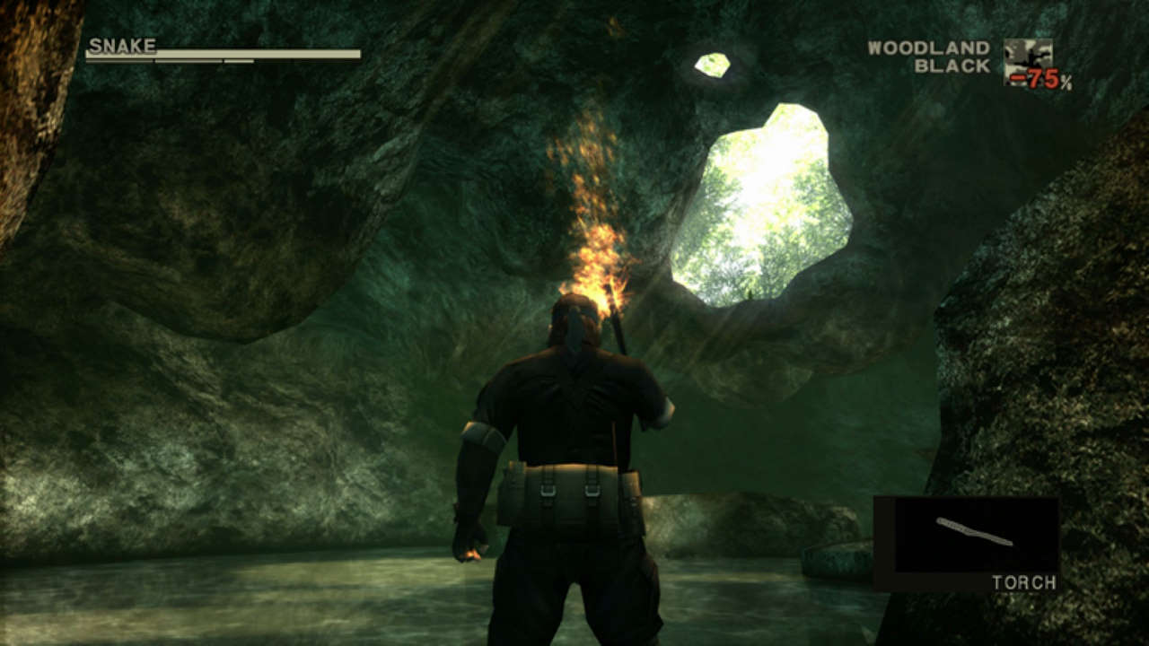 Cette 3e itération varie beaucoup ses environnements entre jungle, forêt, bâtiment, caserne, usine, égout, montagne, etc... Et notre Snake devra se fondre dans le décor, voilà pourquoi on devra gérer son camouflage (le système est très simple et ne permet de modifier qu'un habit et une décoration de visage, mais le concept reste sympathique). De même, en plus d'une jauge de santé, nous avons désormais une jauge d'endurance, il faudra donc nourrir notre personnage. Bien entendu on retrouve les fameuses rations, mais cette fois on pourra également cueillir des fruits et chasser (lapin, rat, serpent... d'où le "snake eater"). Il est aussi intéressant de voir que cette jauge influe sur la vision du héros (qui rétrécie en cas de faim, d'ailleurs on entend son estomac grogner), sa capacité de guérison et même son tonus.