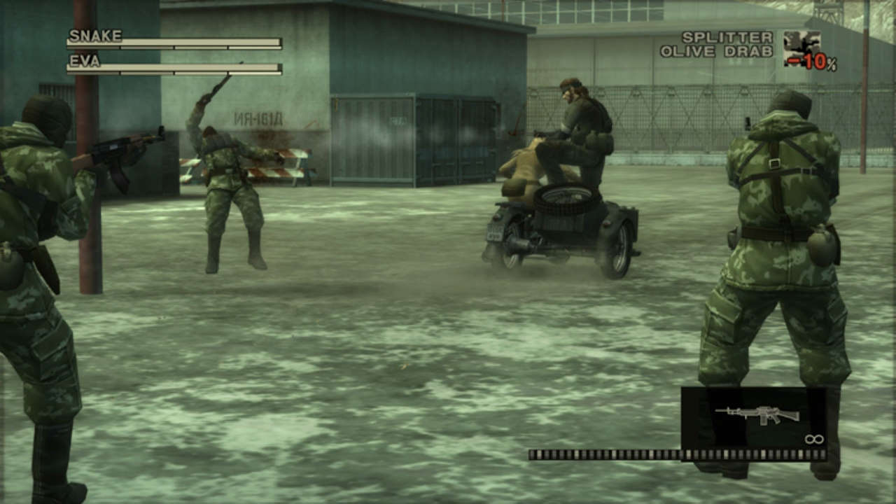 Véritablement révolutionnaire, la mise en scène est entièrement gérée en temps réel et pour cause, le camouflage que nous choisissons ainsi que l'arme de poing (avec ou sans silencieux) apparaissent à l'écran. Tant mieux, ainsi nous n'avons aucune différence entre la cinématique et le jeu lui-même. Et je ne plaisante pas lorsque je dis "évolutionnaire" car MGS3 a aujourd'hui plus de 20 ans et pourtant les cut-scenes ont encore beaucoup de gueule. Elles pourraient même encore donner quelques leçons à certains titres bien actuels. Bien entendu, Kojima et son amour du cinéma font que certaines scènes sont totalement abusées (notamment EVA et sa moto, c'est du grand n'importe quoi) mais en attendant, la qualité de la mise en scène aura servie de maitre-étalon durant des années tant le niveau fut élevé. C'est à tel point qu'aujourd'hui encore (hormis le fait que graphiquement ça a pas mal vieilli) ça passe encore très bien.
