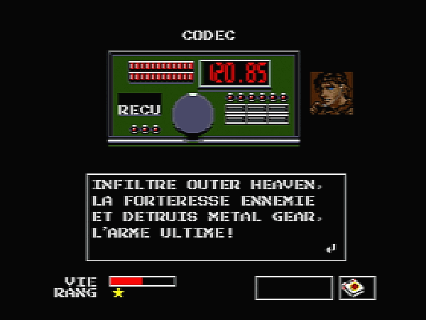 Fumer des clopes pour voir les lasers, les rations, les prémices du Codec et du Soliton, les cartes d'accès, le fameux carton, le combat à mains nues, le double inventaire, le Hind D, le Metal Gear en tant que boss final, Solid Snake, Big Boss, Gray Fox... c'est hallucinant de se dire que tout ça sera reconduit, sous une forme ou une autre, dans tous les épisodes de la série. Ce premier Metal Gear, malgré ses difficultés à nous proposer une mise en scène travaillée, propose malgré tout un excellent scénario et une aventure qui a fait honneur à son support de l'époque. Même si vous ne le finissez pas, je vous conseille d'y jouer au moins un petit peu, à minima pour votre culture ludique.
