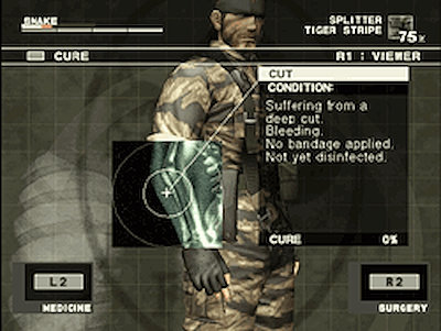 Il faudra d'ailleurs faire attention à ce qu'on mange, car une viande avariée dégoutera notre "snake eater" et le fera vomir, causant au final plus de mal que de bien. Enfin il faudra soigner notre héros : s'il prend une balle, un carreau d'arbalète, s'il est brûlé ou s'il a une fracture, il faudra bien évidemment jouer les infirmières bienveillantes. Encore une fois le système est très simple et se veut plus gratifiant que gonflant, même si encore une fois, ça n'a pas grand-chose de réaliste (parfois Snake a une jambe cassée mais il marche encore, on lui applique une petite attèle et il re-gambade comme un gosse... mais comme je le dis souvent, faut bien faire un jeu).