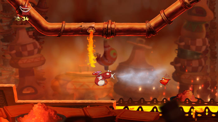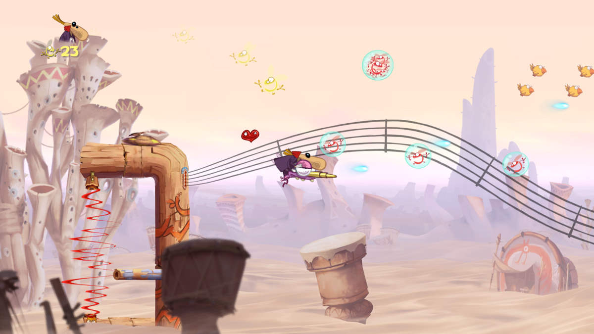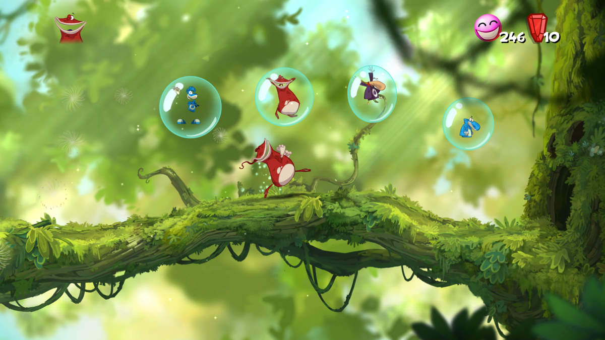 D'ailleurs en solo, l'autre détail qui fâche, c'est qu'en mourrant, on perd tout ! Tous les Lums qu'on a attrapé, les médailles, les Electoons... tout s'envole et on doit tout recommencer. Admettez que c'est quand même assez chiant ! Heureusement, on pourra dégoter des cœurs (ce qui nous permet d'avoir un point de vie en plus... dommage qu'ils ne soient pas cumulables) et surtout, jouer jusqu'à 4 en co-op'. Evidemment là, le jeu semble de suite plus facile et en un sens, plus fun aussi. Car à plusieurs, si on meurt le jeu continue et on retrouve le système de bulles comme dans New Super Mario Bros.