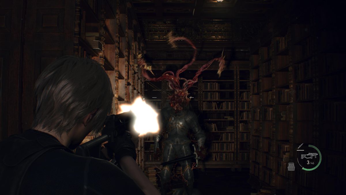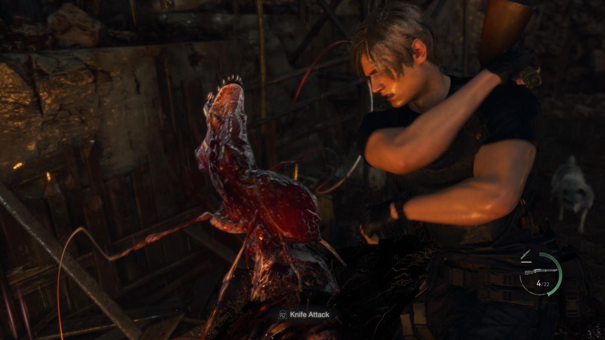 Puisqu'on en est de parler des armes, l'indissociable couteau de Leon possède désormais un indice de résistance. Briser des caisses, occire des ennemis, parer l'attaque d'une tronçonneuse sont autant d'activité qui émousseront votre lame. Le marchand lui rendra sa résistance (contre une somme d'argent bien entendu) et elle aussi pourra être upgradée. Alors certes, le concept est un peu débile mais j'estime qu'il apporte un petit truc sympa, d'autant que le couteau est grandement utile dans le sens où Leon peut désormais s'accroupir et tuer certains ennemis de façon furtive. Bien sûr le jeu n'est pas réellement fait pour ça et contrairement à un Evil Within 2, cette fonctionnalité ne servira que peu car on est toujours rapidement découvert. Ceci dit, je trouve que c'est une sympathique nouveauté.