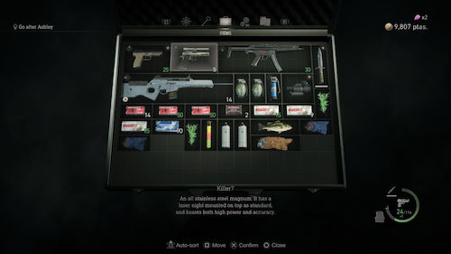 Dans cette même optique, pas mal de coffres (ou de meubles) vous demanderont de trouver soit une petite clé (à usage unique), soit une clé spéciale afin de délivrer leur précieux contenu (cette même clé pourra ensuite être revendue). Le but est bien entendu de récupérer un max d'objets, souvent précieux, qu'on combinera avec d'autres afin d'augmenter le prix final dudit objet. Car le marchand, fidèle à lui-même, vous proposera des upgrades pour votre mallette (qui passera petit à petit du simple au double) ainsi que pour vos armes. On notera par ailleurs que le leveling des pétoires est un peu plus cohérent puisqu'on ne pourra pas atteindre les performances maximales trop vite (en plus du prix que ça coûte). Pour éviter de se retrouver à jouer tout du long avec les mêmes armes (par exemple le fameux Red9 peut s'acheter dès le premier tiers de l'aventure), Capcom a jugé bon de fournir plus d'armes, dont pas mal de nouvelles à l'image de cette arbalète inspirée du Code Veronica, et qui peut être équipée (entre autre) de mines adhésives (il y a aussi un M4 et un Mp5, entre autre chose).