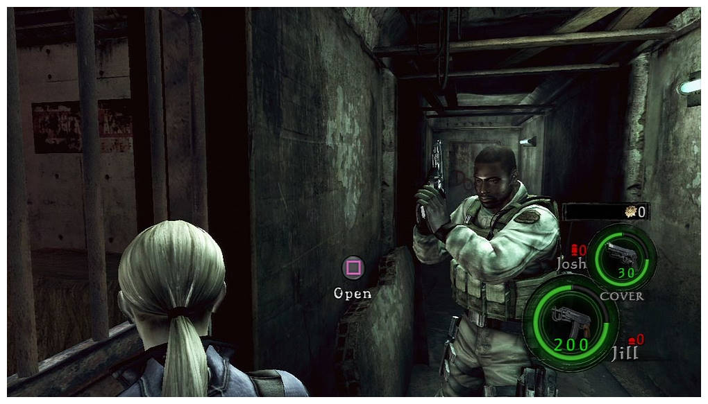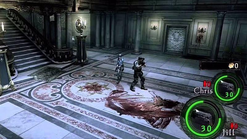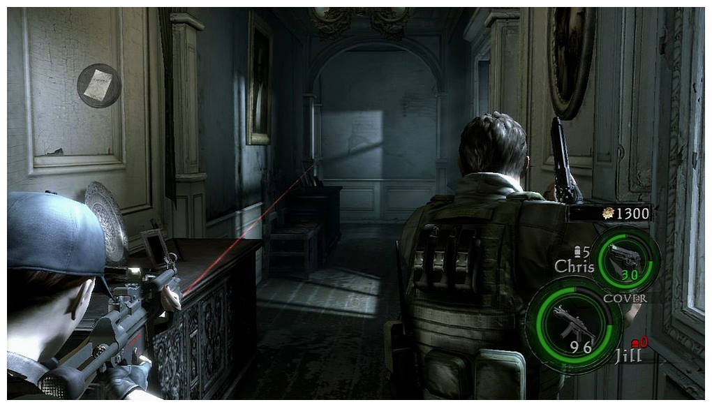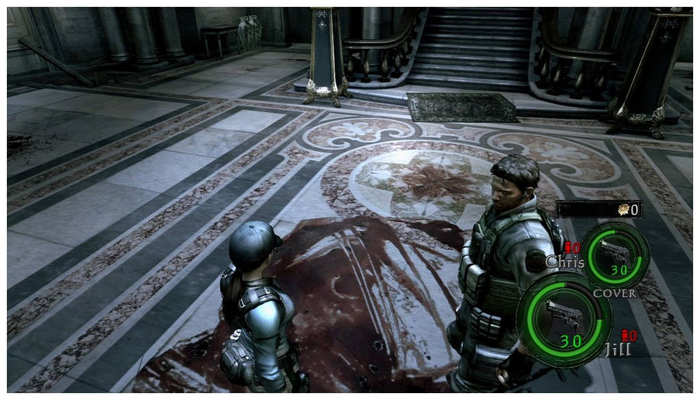 Souvenez-vous, Resident Evil 5 est resté un peu flou sur l'aventure qu'ont vécus Chris et Jill dans le Manoir Spencer. Celui-là même où Wesker tue Ozwell Spencer et où Jill disparait. Vivre ce chapitre "pad en mains" s'annonçait donc passionnant et c'est justement ce que nous propose Capcom. Bon, l'intro est bâclée puisqu'elle est identique à la scène qu'on a déjà vu (il y a juste quelques secondes de plus). Perso j'aurais aimé en savoir plus sur le manoir et savoir comment Jill et Chris en sont arrivés là. L'aventure commence, on y découvre un manoir assez semblable à celui qu'on a parcouru en 1996. Mais rappelez-vous, le manoir a explosé donc ce n'est donc pas le même, c'est une réplique. Et hormis le hall d'entrée, on s'aperçoit très vite qu'en fait ça n'a rien à voir avec celui de l'époque. Par contre, niveau ambiance c'est tout bon. Il n'y a que 3 zombies et 4 pseudo-boss à tuer. L'atmosphère est donc tendue et on s'est même surpris à sursauter. Voilà qui fait plaisir et qui rappelle de vieux souvenirs.