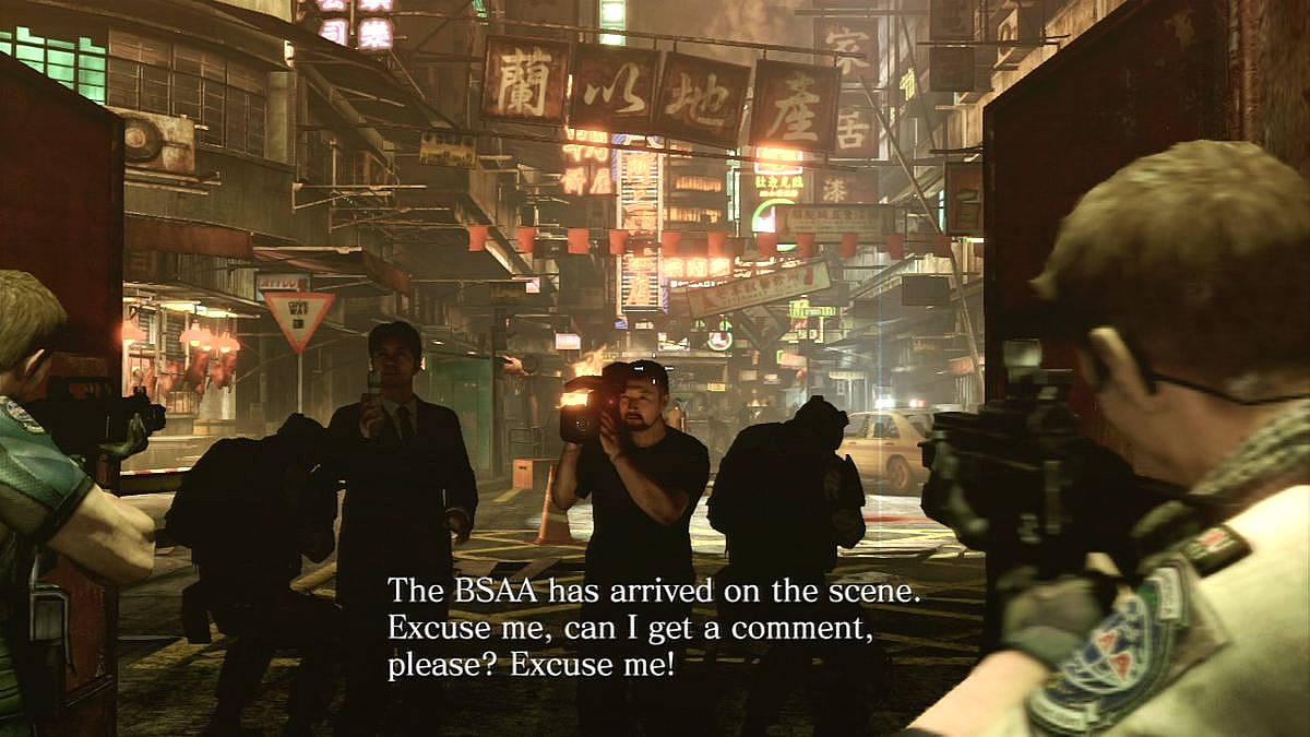 RE6 est un sympathique TPS mais niveau ambiance, c'est raté. Trop d'action tue la moindre sensation de peur... croyez vraiment que l'IA qui gère vos coéquipiers dans Gears of War est meilleure ? Mass Effect, The Witcher 2, Halo Reach, Vanquish, Lost Planet²... croyez-vous vraiment que ces jeux-là font mieux ? Non mais faites-moi rire ! Je ne dis pas que Sheva était la meilleure du lot, mais à bien regarder ailleurs, elle n'était finalement pas si mal. Tout ça pour dire que nos personnages secondaires sont plutôt bien gérés, ils ne nous demandent pas trop de les aider (faut dire qu'on a déjà assez à faire de notre côté), ils s'auto-gèrent assez efficacement et ne tardent pas à réagir lorsqu'une action co-op' doit être réalisée. En somme, c'est pas mal du tout, voire même un cran au dessus que ce qui se faisait précédemment. Maintenant au niveau de l'ambiance, on peut le dire, pour du Resident Evil c'est zéro pointé !
