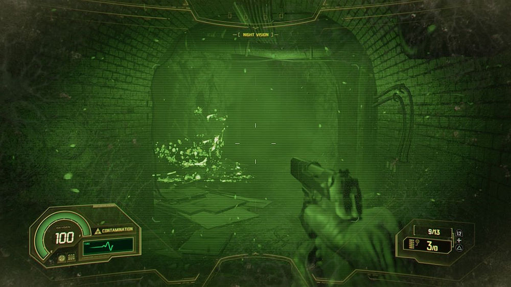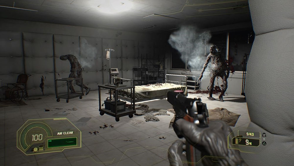 Si l'aventure d'Ethan ne ressemblait pas vraiment à un FPS, avec Chris il en est tout autre. Tout d'abord ce dernier porte un masque, donc à l'écran s'affiche un ATH/HUD où apparaissent le niveau de santé et le niveau d'oxygène. En effet, il y a certains passages où notre personnage est sous oxygène à cause d'un environnement particulièrement toxique. Ce qui parait au départ être une mauvaise idée, loin de l'efficacité d'un Dead Space (une idée bien chiante en plus, puisqu'au début le temps est vraiment court), il s'avère au final que ce n'est pas si mal en fin de compte (une fois encore, ça rend service à l'exploration).