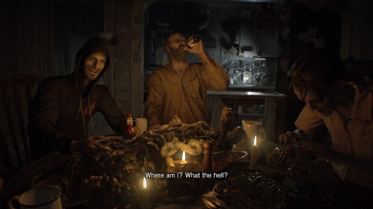En VR l'expérience est décuplée ! Dommage qu'au passage on perde en qualité graphique et que ce soit réservé à la PS4 Evil 7 est souvent stylisé en "RESIDENT EVII" (car pour ceux qui ont quitté l'école trop tôt, VII en chiffre romain donne 7 en chiffres indo-arabes). Le titre est également sous-titré "biohazard", soit le nom japonais de la licence. Pourquoi ont-ils apposés un tel sous-titre ? Allez savoir, en attendant Resident Evil 7 fut longtemps le grand ambassadeur de la VR... sur PlayStation 4. Sur PS4 seulement ? Et oui malgré de belles promesses, Capcom n'a jamais daigné convertir son mode VR sur PC, ce qui est assez absurde puisque les HTC Vive et Oculus Rift restent actuellement les meilleurs produits pour profiter de la VR, quand le PS VR reste l'entrée de gamme de ce couteux gadget optionnel. Maintenant, si je ne suis pas un fan de VR, je respecte les goûts de chacun. Pour moi un jeu se pratique (surtout un comme celui-ci) devant un grand écran, manette en mains, un casque sur les oreilles (histoire de mettre le son bien fort sans gêner les enfants qui dorment), le fessier dans un canapé ou un fauteuil et surtout, seul dans le noir. Là on profite au maximum de l'ambiance et de ce qu'un jeu a à nous offrir.