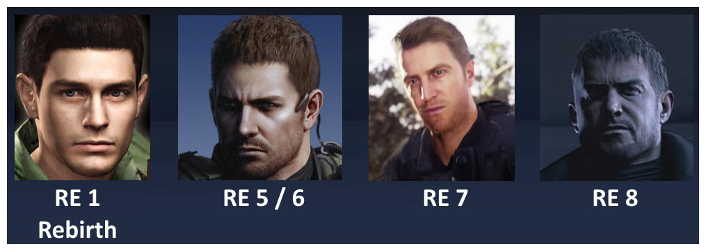 Il est quand même aberrant de voir que dans ses Resident Evil, Capcom change si souvent le design de ses héros... contre il est à nouveau inadmissible que Chris Redfield ait ENCORE (!) changé de gueule et de physique ! Souvenez-vous, en début de carrière l'ami Redfield ressemblait à un minet japonais typique, propre sur lui et sympa. Jusqu'au jour où Capcom à péter un câble et nous a livré dans RE5 un buffle sous stéroïdes qui visiblement n'avait pas besoin d'armes à feu, tant le musclor du BSAA aurait pu défaire ses ennemis à grand coup de patates ! Mais soit, on a fini par l'accepter jusqu'au jour où on l'a revu à la fin de Resident Evil 7 et que visiblement il fut passé au déshydrateur alimentaire tant on a eu bien du mal à reconnaitre "la crevette" qu'on avait sous les yeux. Et là, d'un épisode à l'autre, il change à nouveau de gueule et même de physique...