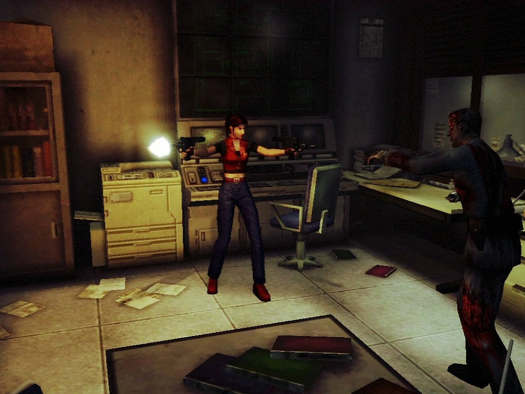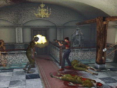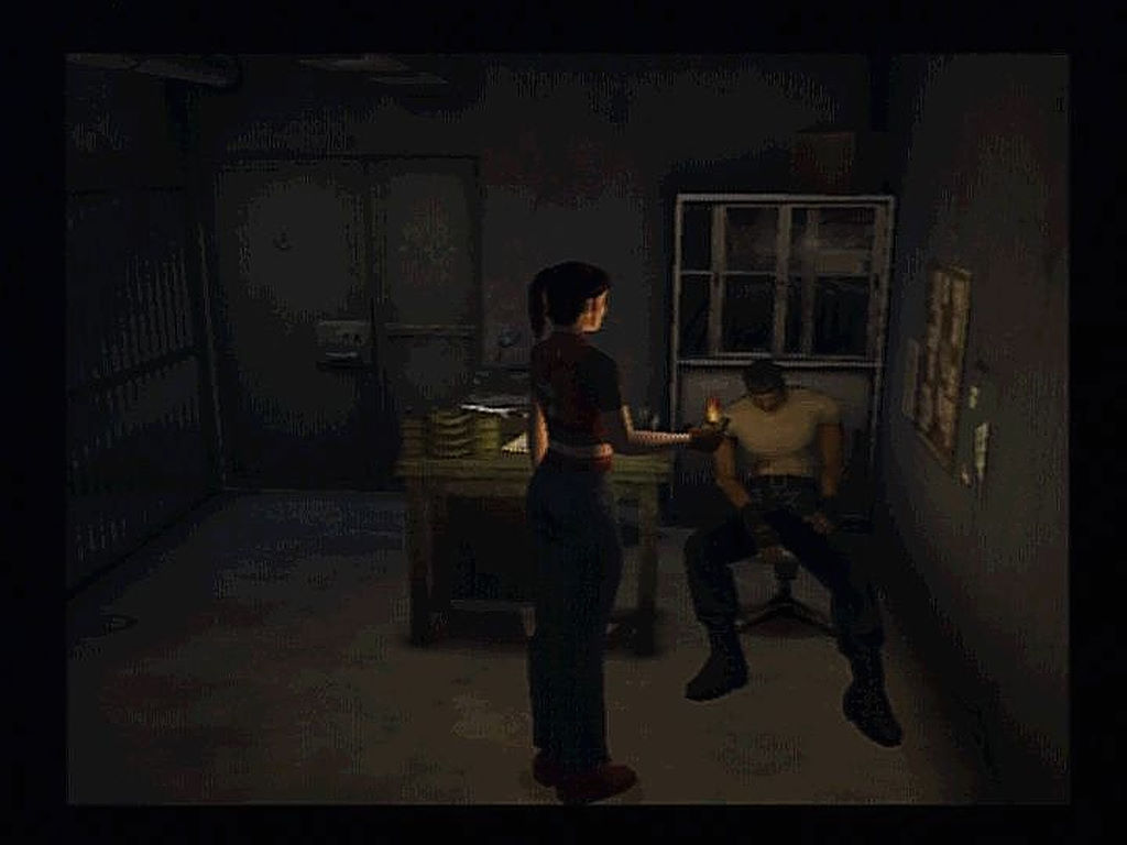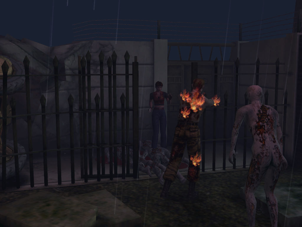 Et pour l'animation c'est un peu pareil. Clairement en dents de scie, elle ne sévit pas de la même manière à tous les étages : d'un côté nos héros sont bien modélisés (surtout pour des visages étonnament expressifs) et la plupart des animations sont super fluides, réalistes. Comme je l'évoquais précédemment, ça donne des cut-scènes vraiment splendides, tantôt chargées d'action, tantôt chargées d'émotion, une première dans un Resident Evil (les lèvres bougent enfin lorsqu'ils parlent). Mais d'un autre côté, malgré le passage à une machine bien plus puissante que cette bonne vieille PSOne, il subsiste d'anciennes tares qui n'ont toujours pas été gommées. En effet les zombies s'écroulent sous nos coups de feu assez bizarrement (le rendu n'est pas naturel), les ombres sont restées vulgairement rondes, Claire (comme Chris ou Steve) est raide comme un piquet (plus encore que lors de RE2, c'est dire) et le pire de tout, c'est que nos héros ne bougent pas les jambes en tourant sur eux-même (tout juste écartent-ils les pieds).