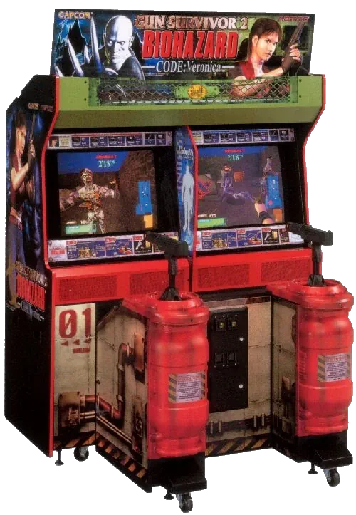 Jouable en solo comme à 2 en co-op' selon le format de la borne, il propose un rail shooter tout ce qu'il y a de plus classique, tout en portant le nom de Gun Survivor 2 : Biohazard Code Veronica au Japon. Cependant, très vite on remarque le manque d'ambition du titre. En effet, il n'est pas rare que ce genre de borne soit déclinée en plusieurs versions, notamment des éditions Deluxe, avec des répliques de qualité et de grands écrans. Mais pas ici, ce Survivor 2 ne propose qu'une unique version (solo ou à 2 joueurs), avec une réplique de MAC-10 disposant d'un silencieux. Connaissant le jeu, l'arme est assez inappropriée puisque Claire utilise un Beretta 92 et Steve des Lugers dorés. Ça n'a donc rien à voir, sans doute parce que cette borne est le recyclage d'un autre modèle, d'un autre jeu.