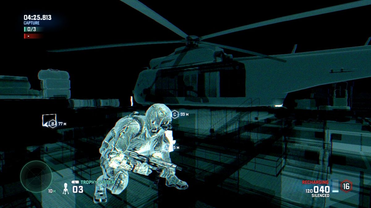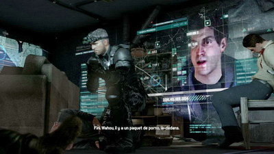 Les nouveaux gadgets (comme ici les lunettes sonar) sont bien sympathiques l'argent qu'on gagne au fil du jeu, on va tout améliorer à commencer par le Paladin. L'améliorer permet de débloquer certaines fonctions ou gadgets, d'ailleurs cette base flottante rappelle sans mal le vaisseau d'un certain Mass Effect. On y discute avec le staff, on téléphone à Sarah (la fille de Sam), et surtout on accède à une map monde où sont disposées les missions actives. Après niveau améliorations, tout se monnaye ! Mais c'est aussi l'occasion de s'acheter de nouvelles armes, de les upgrader, d'améliorer sa combinaison (pour quelle soit plus furtive et/ou plus résistante, qu'elle porte plus de gadgets, etc...) ou ses lunettes triglobes (pour une pratique fonction "sonar" qui permet de détecter les ennemis quelque soit leur position). Si bien sûr on retrouve la fameuse caméra-serpent, on pourra aussi se payer des grenades, des mines en tout genre, des caméras-glue ainsi qu'un drone tri-rotors directement inspiré de Ghost Recon : Future Soldier.
